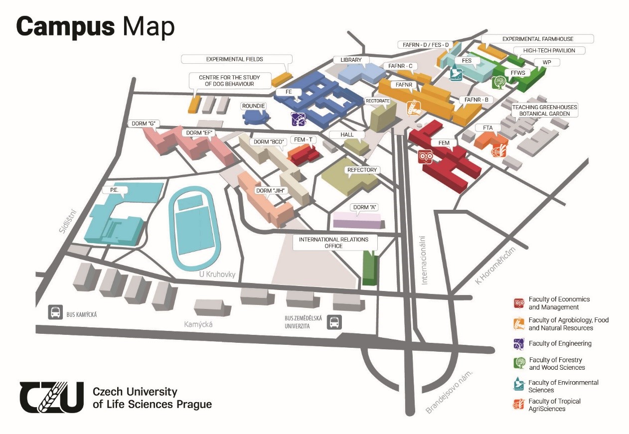 Šīs fakultātes atrodas visas vienā vietā, veidojot studentiem savu vidi – atsevišķu pilsētiņu, kurā dzīvot un mācīties. Universitātes teritorija ir plaša, tajā atrodas ne tikai fakultātes, bet arī dienesta viesnīcas un sporta komplekss, kurā ir liela sporta zāle, baseins, apkārt tenisa, basketbola, volejbola un citu sporta veidu laukumi. Teritorijā ir arī mini zoo, kurā dzīvo truši, vistas, cūkas, aitas, kazas, alpakas un pat govis ar teļiem, kā arī botāniskais dārzs un citas saistošas vietas un objekti. Studentu atpūtai ir izveidotas kafejnīcas un centra laukumā izlikti soliņi, kur var apsēsties un izdzert kafiju vai papusdienot. Darbojas arī universitātes suvenīru, pārtikas, gaļas veikali, sporta bāri un klubs. Universitātes teritorija ir pārdomāta un tajā iekļauts pilnīgi viss, ko studentam vajag.