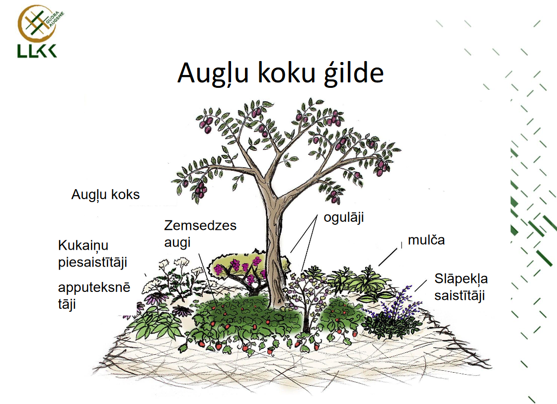 Atkarībā no mērķa veidosies stratēģija. Sākotnēji ir arī jāiepazīstas, kas aug jūsu tuvējās apkārtnes mežos, jāmācās no vietējās ekosistēmas, lai varētu to atdarināt. Šie novērojumi ir svarīgi tādēļ, lai zinātu, kādu augi vislabāk augs jūsu apkārtnē. Izveidojiet augu sarakstu, ko varēsiet izmantot, lai atrastu savvaļas augu komerciālos produktīvos variantus, kurus audzēt savā pārtikas mežā. Vērtīgi varētu būt arī nodot augsnes analīzes, lai gūtu lielāku sapratni. Pamatojoties uz šo pētniecisko informāciju, izveidojiet sava dārza projektu (karti) – zīmējiet ar roku vai kādu interneta rīku. Tālāk jau jāķeras klāt pie dizaina – kā izkārtot jūsu vēlamos augus, kas atkarīgs no mērķiem un vietas īpatnībām. Daloties dažādos piemēros, Māris rādīja augu ģildes paraugus/modeļus. Augu ģilde ir – augi (augu kopums), kurus ierīko zem konkrētā augļu koka, ievērojot visus pamatprincipus un augu funkcijas, kam ir jābūt meža dārza sistēmā (pievienots attēls, lai radītu priekšstatu).