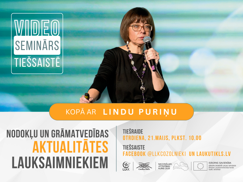 Video semināru vadīs grāmatvedības eksperte, LLKC Grāmatvedības un finanšu nodaļas vadītāja Linda Puriņa, kura ieskicēs tās būtiskās lietas, kurām lauksaimniekam jāpievērš uzmanība: “Mainās ne tikai likumi un noteikumi. Mainās arī saimnieciskā darbība un kļūst aktuāli tie grāmatvedības un nodokļu nosacījumi, kas iepriekš nebija saistoši. Tādēļ saimniekam vienmēr ir svarīgi turēt roku uz pulsa!”