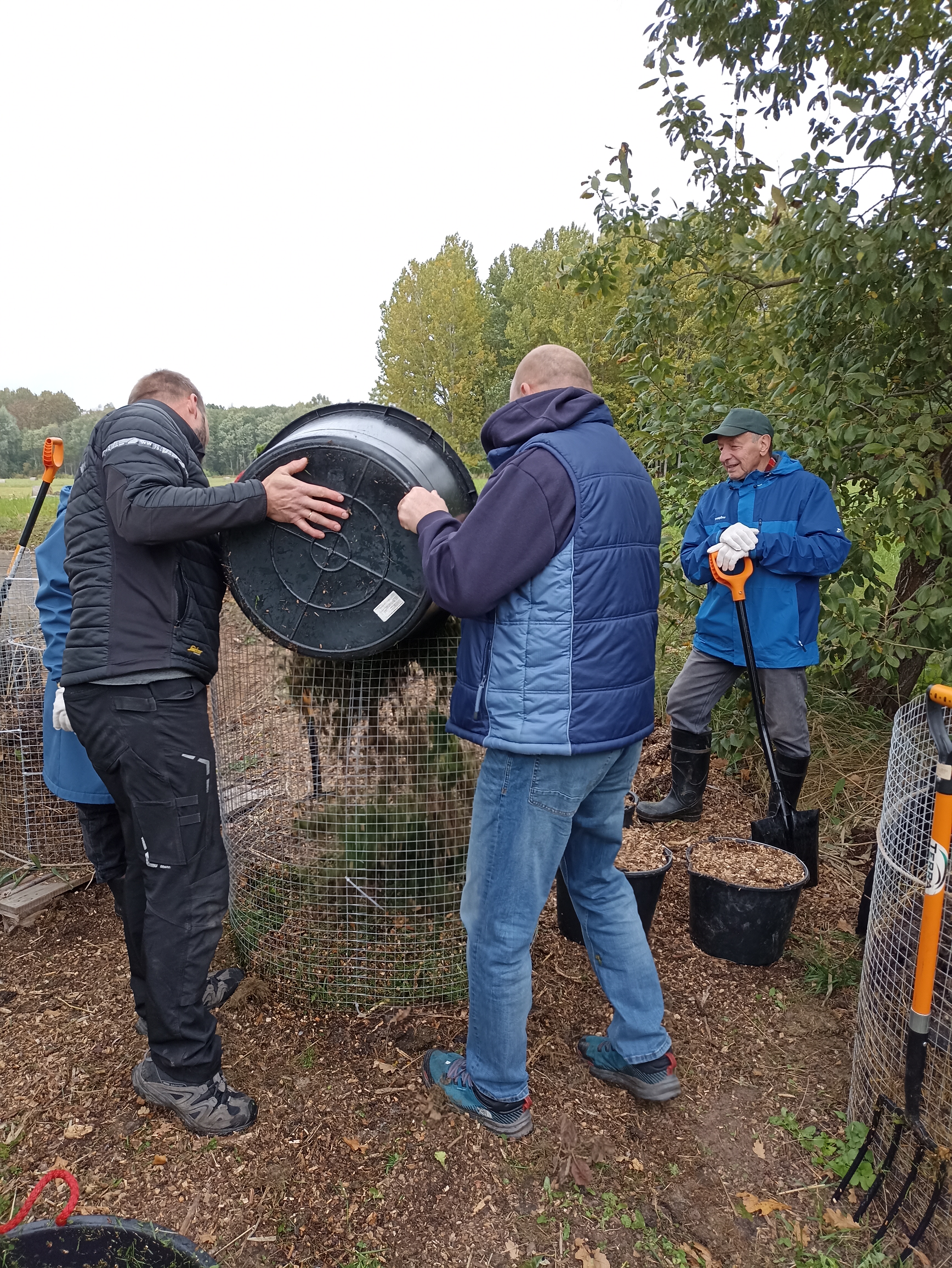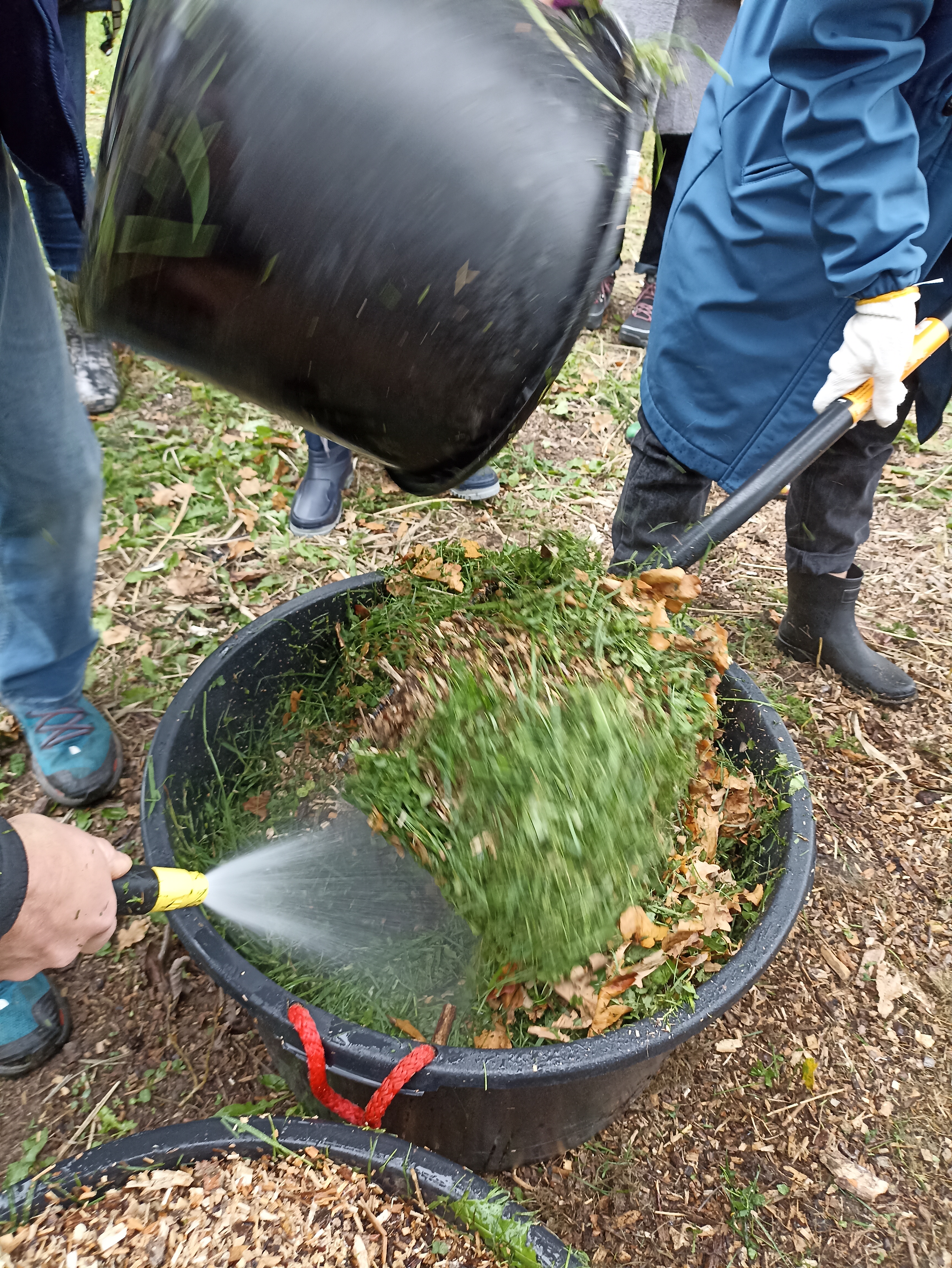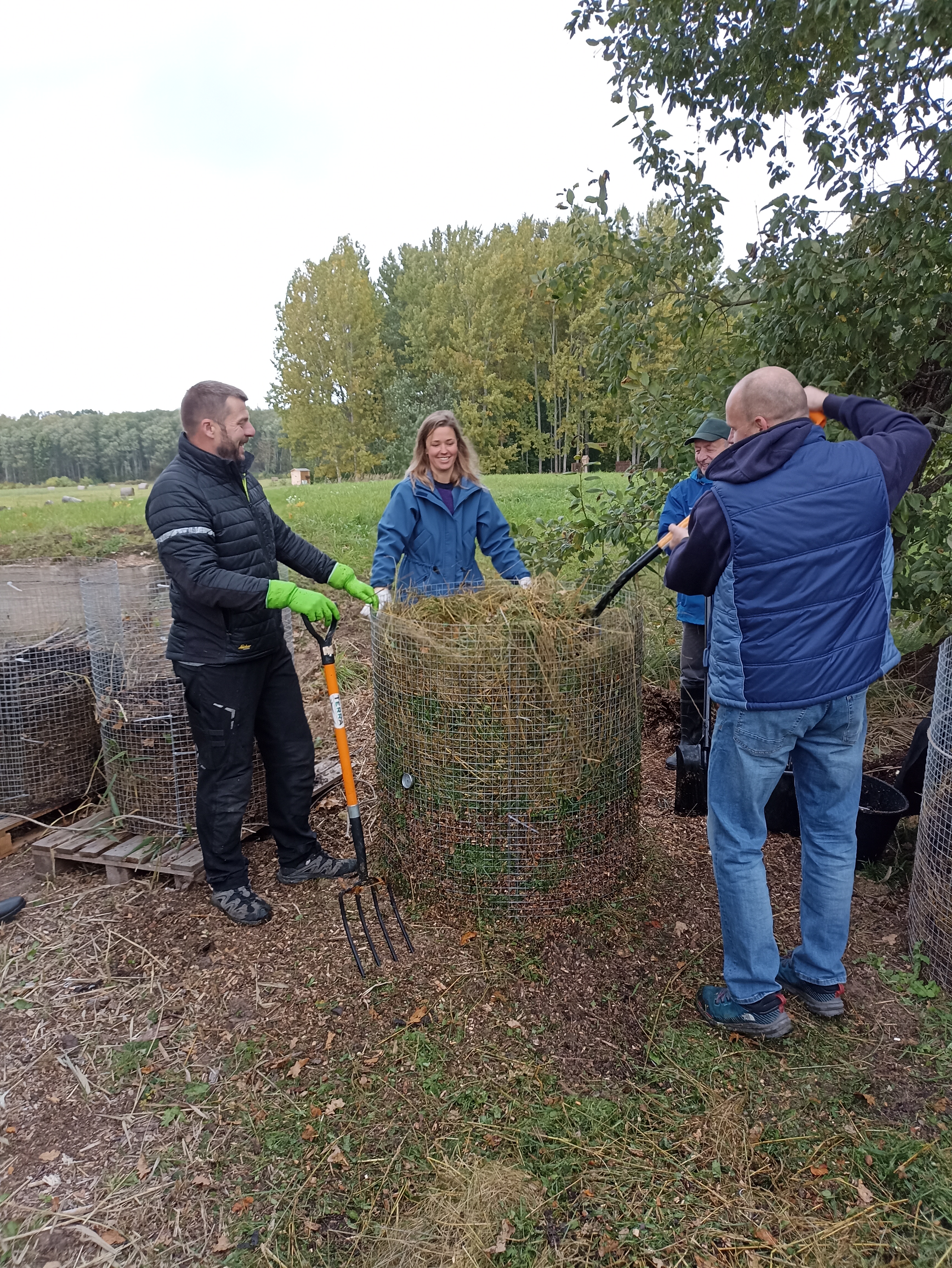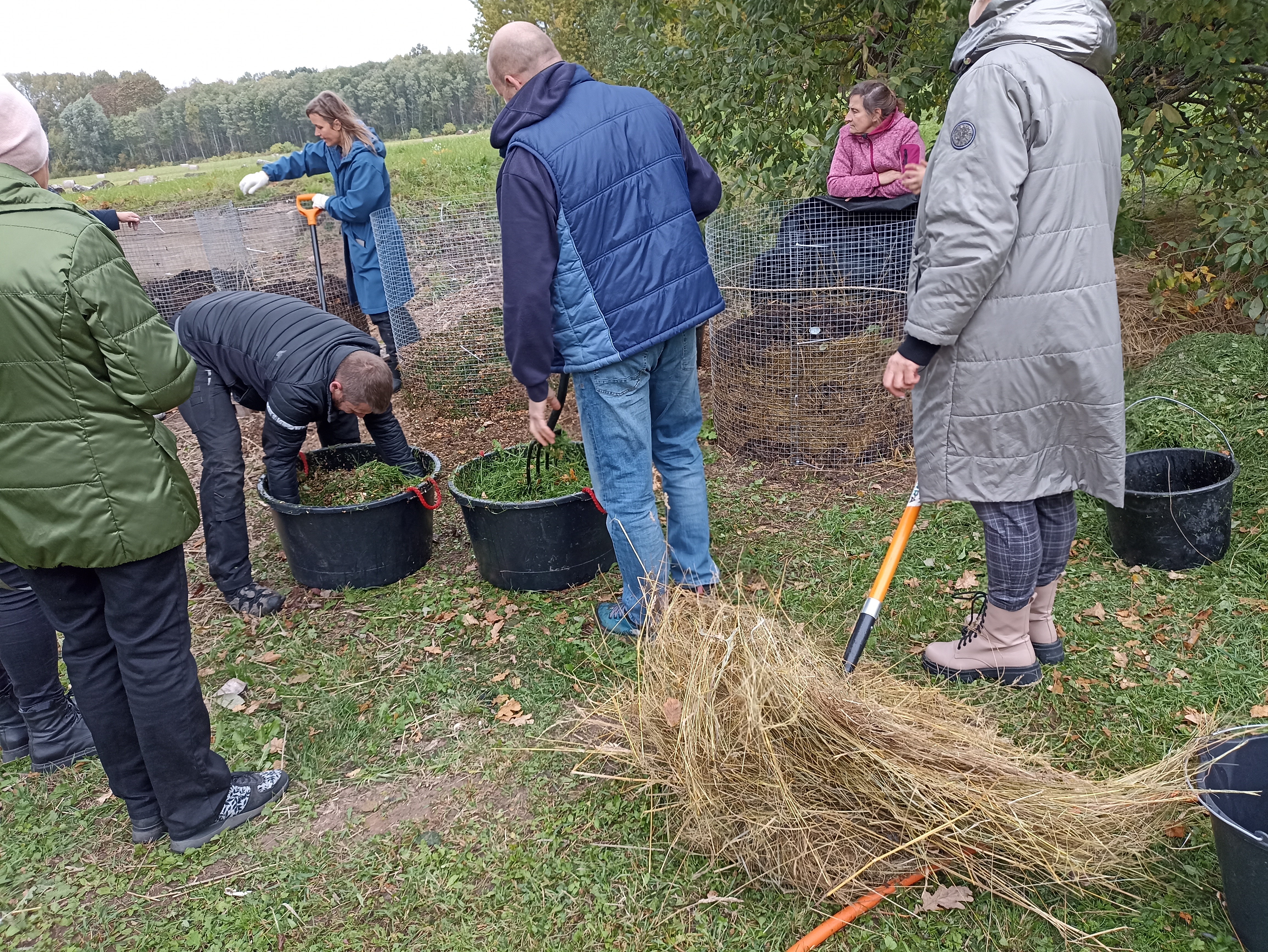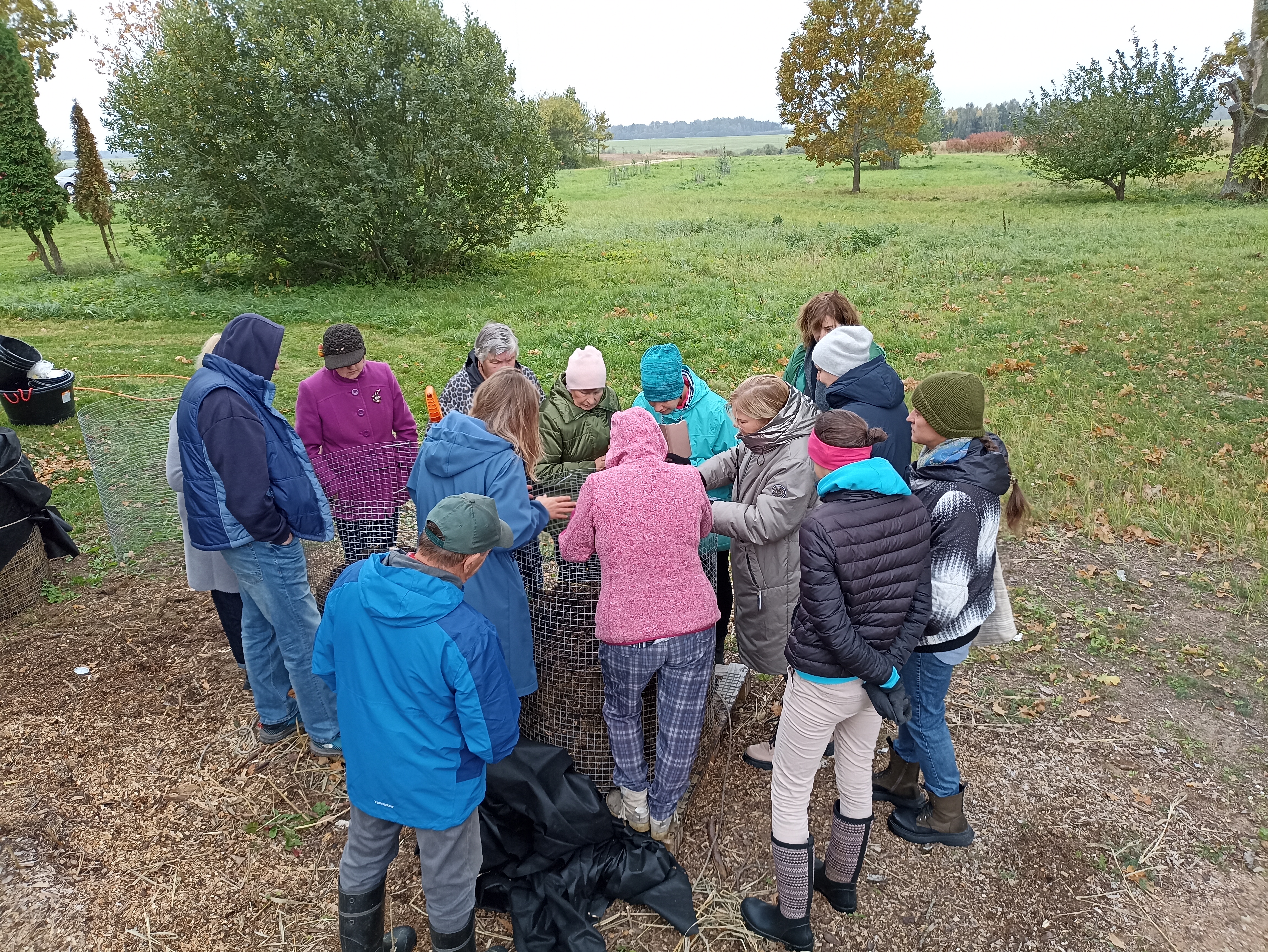 Semināra praktiskajā daļā tā dalībnieki kopā ar lektori veidoja termokompostu. To darot, svarīgi ir radīt aerobus apstākļus, nodrošināt 50% mitrumu, ievērot pareizu C/N attiecību, ko nodrošina 2/3 “brūnā” masa un 1/3 “zaļā” masa.