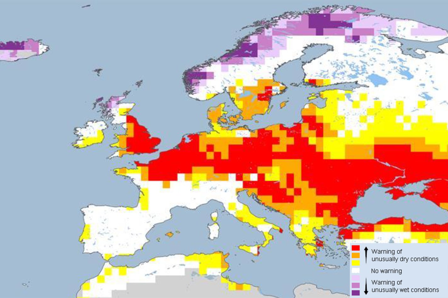 Spēcīgs sausums skar plašus reģionus Centrāleiropā, Ziemeļeiropā un Austrumeiropā, kā arī Vidusjūras austrumu daļā un Āfrikas ziemeļrietumos, būtiski ietekmējot augu veģetāciju un upes. Šos sausuma apstākļus izraisīja lietus trūkums no marta līdz maija beigām, ko vairākos reģionos pastiprināja temperatūras, kas bija virs vidējās. Temperatūras anomālijas, kas pārsniedz vidēji 2 °C, tika novērotas, piemēram, Islandē, Norvēģijas dienvidos, Īrijā, Francijas ziemeļos un Alpos.