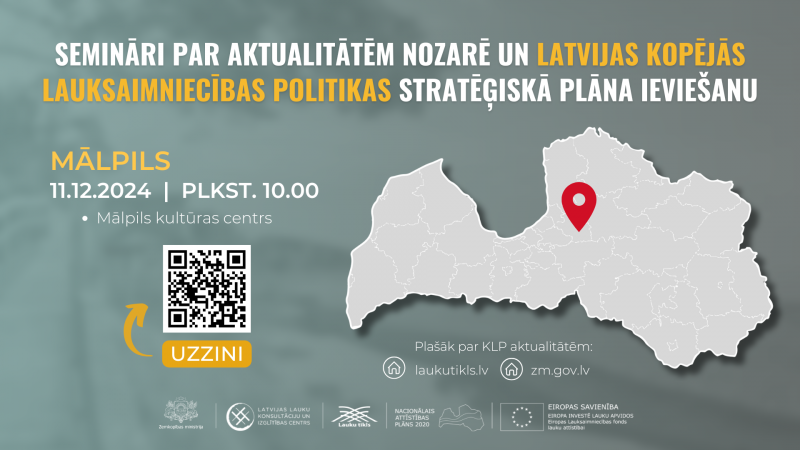 Trešdien, 11. decembrī, eksperti no Zemkopības ministrijas (ZM) un tās padotības iestādēm apmeklēs Mālpili, lai uzklausītu reģionālo lauksaimnieku jautājumus un informētu par aktualitātēm nozarē un Latvijas Kopējās lauksaimniecības politikas Stratēģiskā plāna (KLP SP) ieviešanā 2025. un turpmākajos gados.