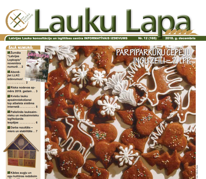 Iznācis LLKC informatīvā izdevuma “Lauku Lapa” decembra numurs. Tajā atskats uz LLKC rīkoto konferenci “Piena lopkopība Latvijā – cik konkurētspējīgi (efektīvi) esam?”. Publicēta plašāka informācija par to, kā kviešu lauku apsaimniekošanai top atbalsta sistēma internetā, kur ar savu ieguldījumu citu partneru vidū iesaistās arī LLKC. Augkopjiem būs noderīgs arī materiāls par demonstrējumu, kurā tiek pētīta augu maiņas nozīme bioloģiskajā lauksaimniecībā.