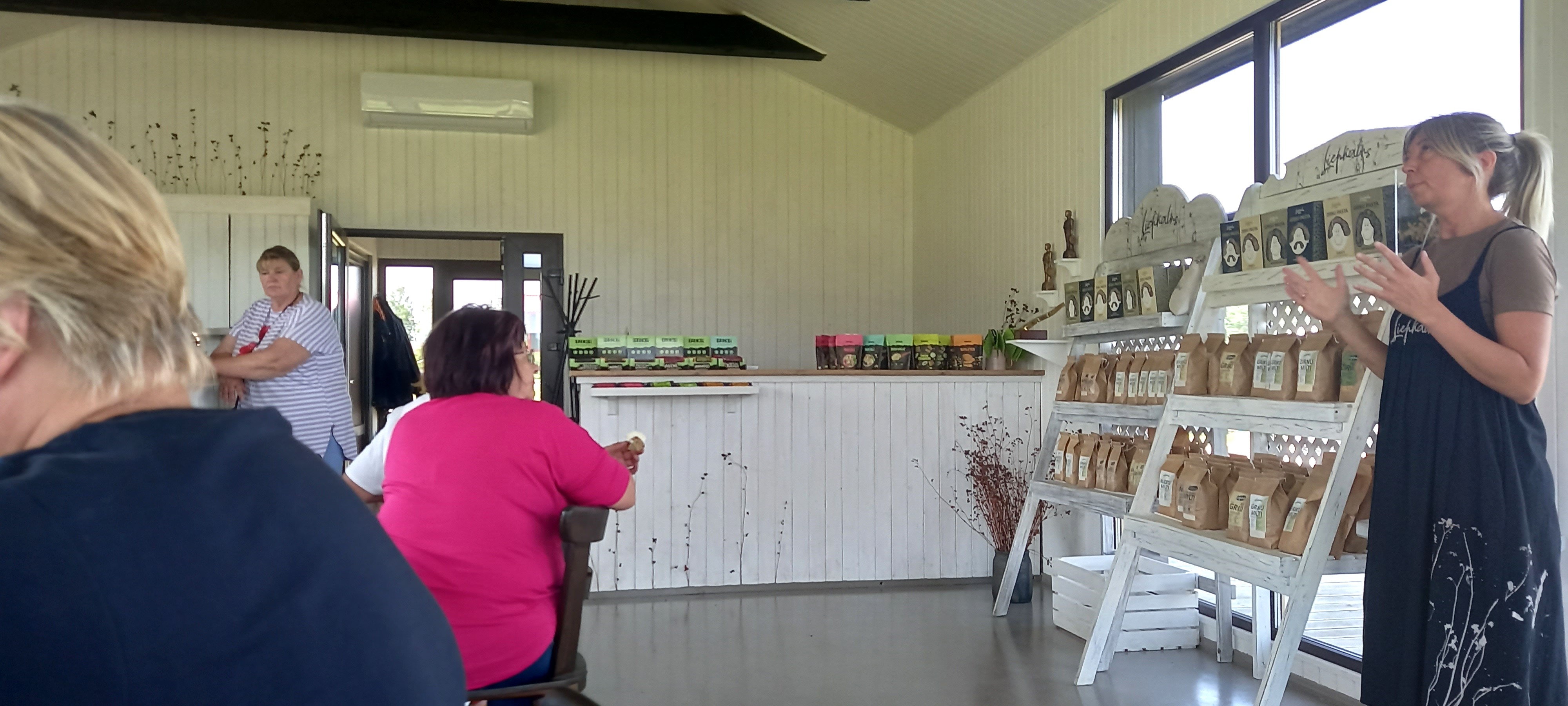 Turpat Dekšāres pagasta centrā iedvesmojošs Vinetas Knipas stāsts par uzņēmējdarbības uzsākšanas pieredzi. Atgriezusies Dekšārē no Vācijas, viņa sāka darboties gaļas lopkopībā. Taču nejaušība aizveda pie citas, blakus nozares. Radās iespēja iegādāties veikala telpas, tad no Vācijas tika iegādāts virtuves aprīkojums un arī pieprasījums pēc produkcijas negaidīja. Sakārtojot telpas atbilstoši prasībām, varēja uzsākt pasūtījumu nodrošināšanu gan individuālajiem klientiem, gan bērnu nometnēm, arī mūsu brauciena dalībniekiem bija iespēja ar kafiju pagaršot garšīgu plātsmaizi. Vineta piekrita izaicinājumam un veiksmīgi tiek ar to galā, tas ir iedvesmojoši arī citiem.