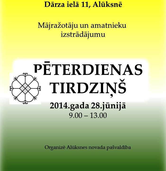 Sestdien, 28. jūnijā no plkst.9.00 līdz 13.00 Dārza ielā 11, Alūksnē notiks Pēterdienas tirdziņš, kurā savu produkciju piedāvās mājražotāji un amatnieki.