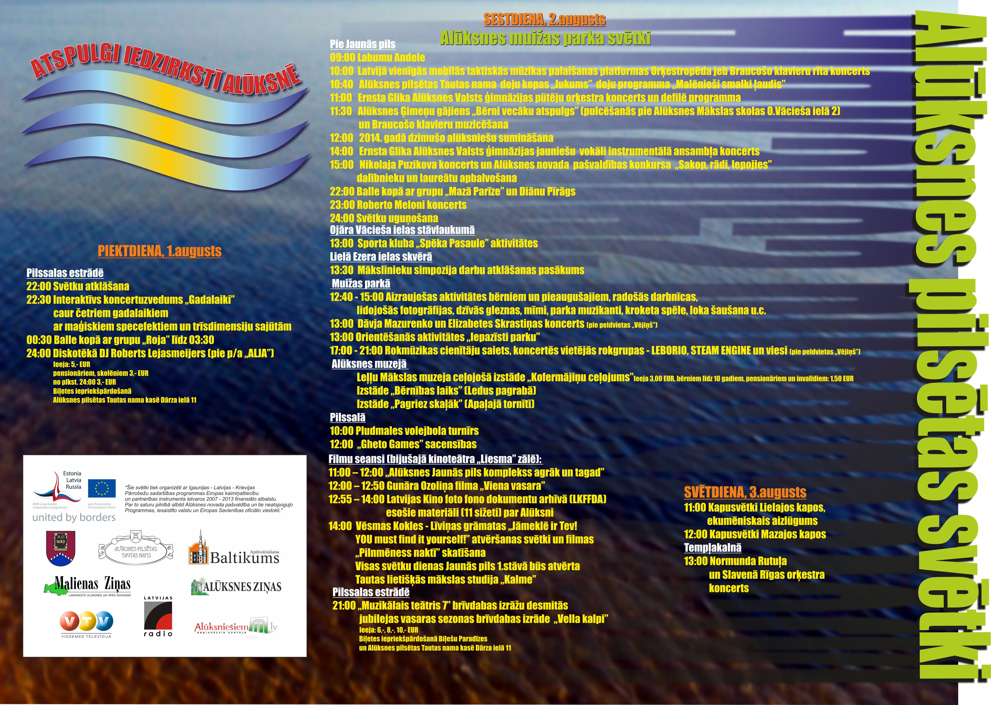 Svētkiem dots nosaukums „Atspulgi iedzirkstī Alūksnē” un tie sola dažādas saistošas aktivitātes kā bērniem, tā pieaugušajiem. Alūksnes pilsētas svētki jau tradicionāli iesāksies piektdienas vakarā ar atklāšanas pasākumu Pilssalas estrādē, kam sekos krāšņs, emocionāls koncertuzvedums „Gadalaiki”, kurā līdz ar Sonoras Vaices, Anmary, Andra Ērgļa un Daumanta Kalniņa muzikālajiem priekšnesumiem būs vērojami gaisa akrobāti, dejotāji un dažādi negaidīti specefekti. Pirmās svētku dienas noslēgumā turpat romantiskajā Alūksnes Pilssalā būs gan zaļumballe ar grupu „Roja”, gan diskotēka ar DJ Robertu Lejasmeijeru.