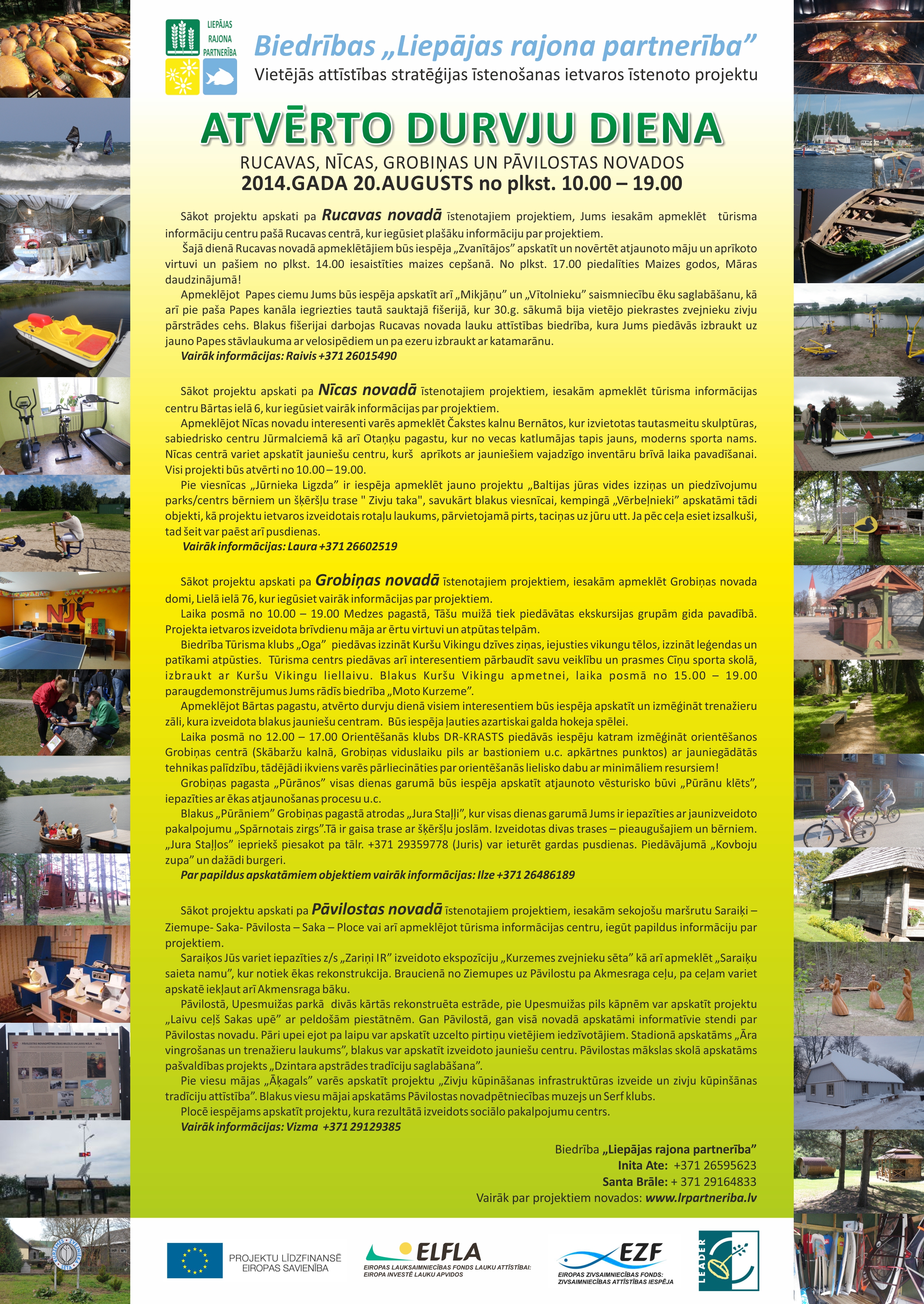 Biedrība "Liepājas rajona partnerība" vietējās attīstības stratēģijas īstenošanas ietvaros organizē īstenoto projektu "Atvērto durvju dienas", kuras norisināsies 13. un 20. augustā.