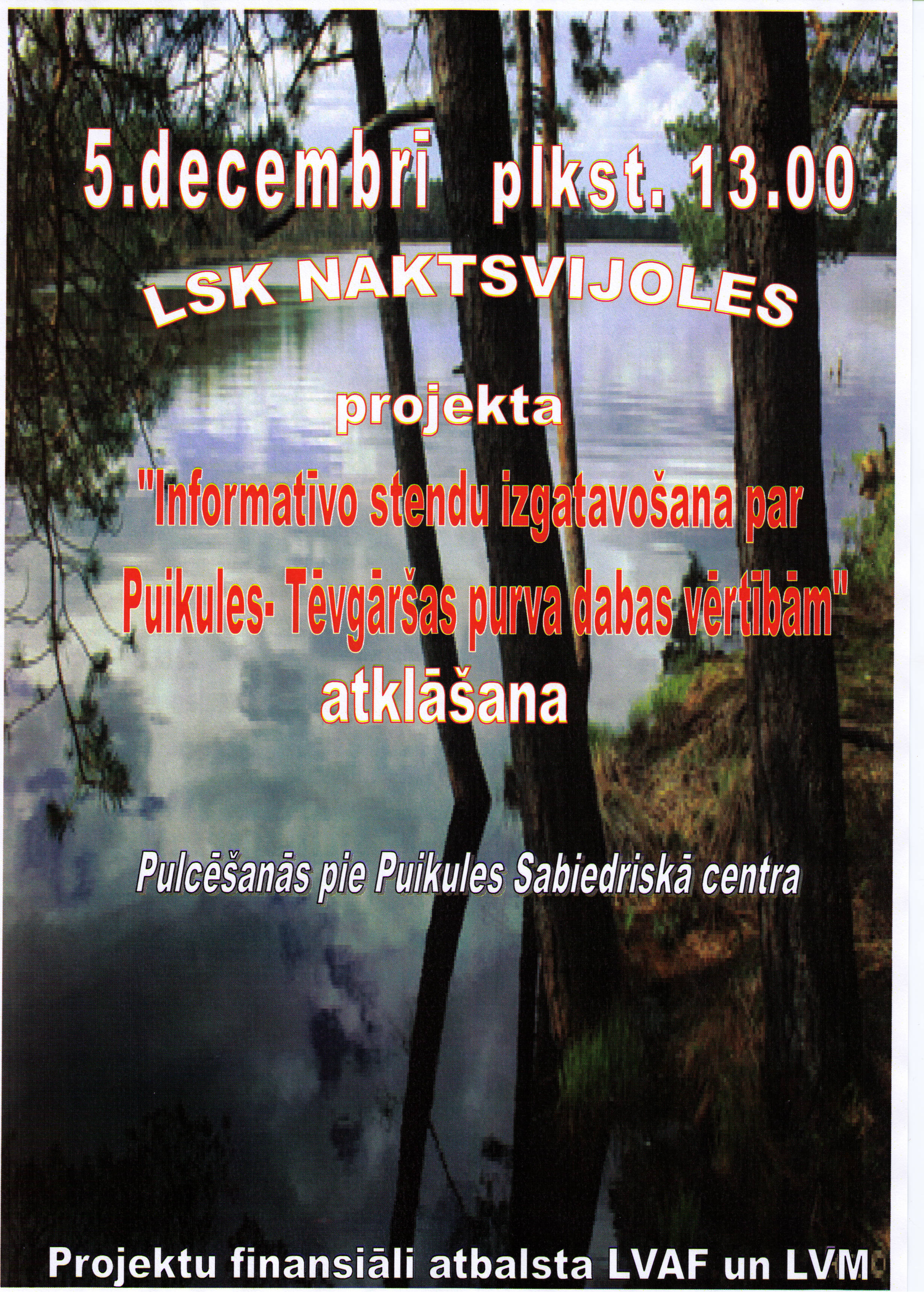 LSK Naktsvijoles projekta "Infomatīvo stendu izgatvošana par Puikules - Tēvgāršas purva dabas vērtībām" atklāšana. Pulcēšanās pie Puikules Sabiedriskā centra.