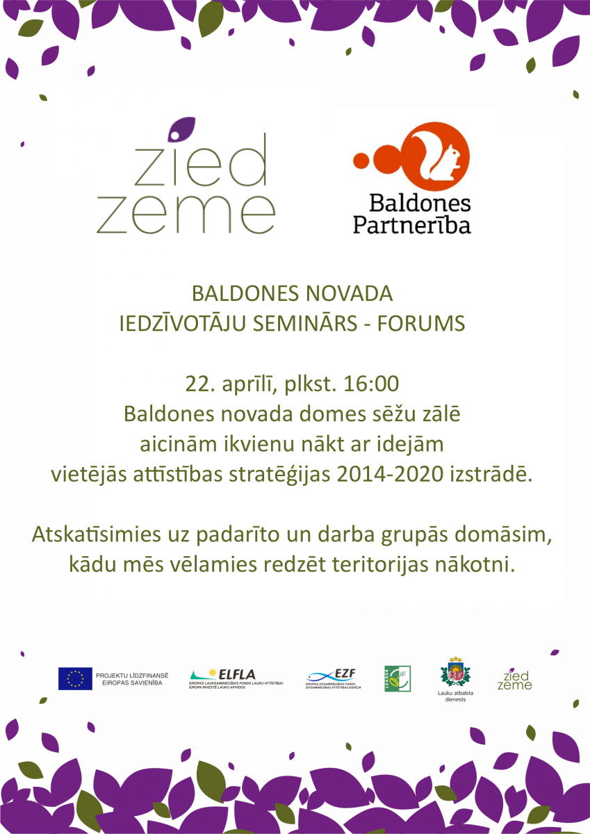 PPP biedrība Zied zeme un Baldones partnerība 22.aprīlī aicina Baldones novada iedzīvotājus dalīties ar savām idejām par apkārtējās vides un sabiedriskās dzīves attīstību reģionā iedzīvotāju seminārā–forumā par LEADER projektu iespējām. Pasākuma laikā tiks apkopoti iedzīvotāju ierosinājumi teritorijas attīstības stratēģijai jaunajam plānošanas periodam. Šajā periodā Baldones partnerība darbosies PPP biedrības Zied zeme sastāvā.