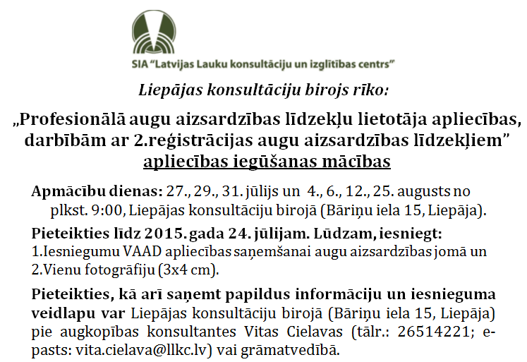 „Profesionālā augu aizsardzības līdzekļu lietotāja apliecības, darbībām ar 2. reģistrācijas augu aizsardzības līdzekļiem” apliecības iegūšanas mācības.