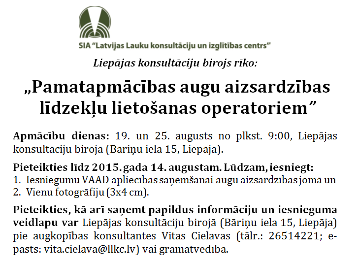 „Pamatapmācības augu aizsardzības līdzekļu lietošanas operatoriem”.