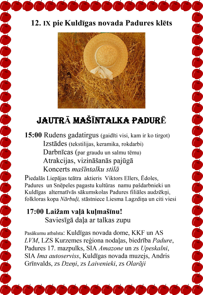 Sestdien, 12. septembrī, Kuldīgas novada Padurē pie Padures muižas klēts norisināsies pasākums “Jautrā mašīntalka Padurē” ar gadatirgu, izstādēm, koncertiem, radošajām darbnīcām un iespēju darbībā redzēt īstu darbojošos kuļmašīnu. Pasākumu vadīs un mašīnista lomā iejutīsies Liepājas teātra aktieris Viktors Ellers.