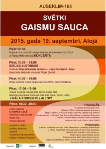 Svētku kulminācijā – dziesmu jaunrades konkursa „Kas mēs bijām, būsim, esam” fināla koncerts “Lai top!”. 19.septembris Alojas bibliotēkā-page-0Koncertā 16 mūzikas skolu kori no Salaspils, Rīgas, Ādažiem, Aizkraukles, Vecumniekiem, Strenčiem, Smiltenes, Alojas, Saulkrastiem, Cēsīm, Madonas, Valmieras un Jelgavas izpildīs konkursā godalgotās dziesmas, un kopā ar Latvijas Kultūras akadēmijas jaukto kori „SŌLA” un Ādažu mākslas un mūzikas skolas kamerorķestri Jāzepa Vītola dziesmas ar Ausekļa vārdiem, kā arī konkursam veltītos darbus. Ausekļa dzeju runās Jānis Streičs, koncertu vadīs mūzikas žurnālists Orests Silabriedis.