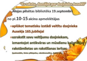 19.septembrī Alojā, svētkos „Gaismu sauca” svinēsim alojiešu izcilākā novadnieka, dzejnieka Ausekļa 165.dzimšanas dienu.