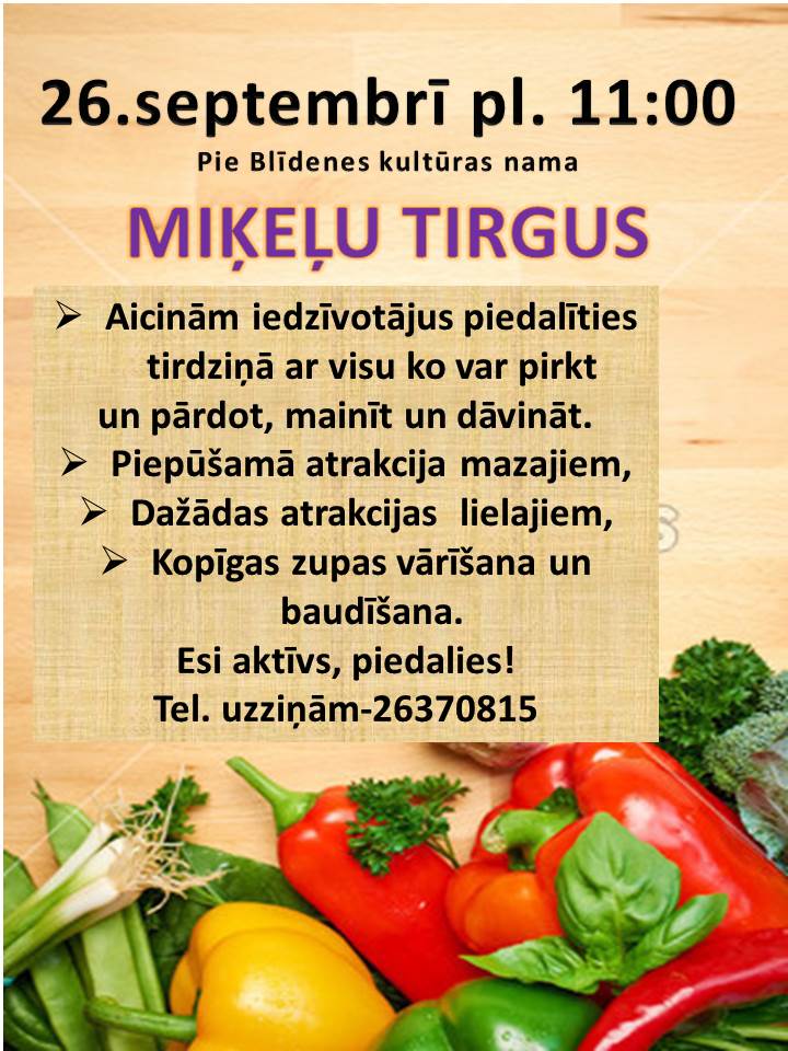 Miķeļtirgus Blīdenē pie pagasta 26. septembrī. Aicinām iedzīvotājus piedalīties ar visu, ko var pirkt, pārdot, mainīt, dāvināt. Pasākuma laikā būs dažādas atrakcijas lieliem un maziem. Būs arī kopīga zupas vārīšana un baudīšana.