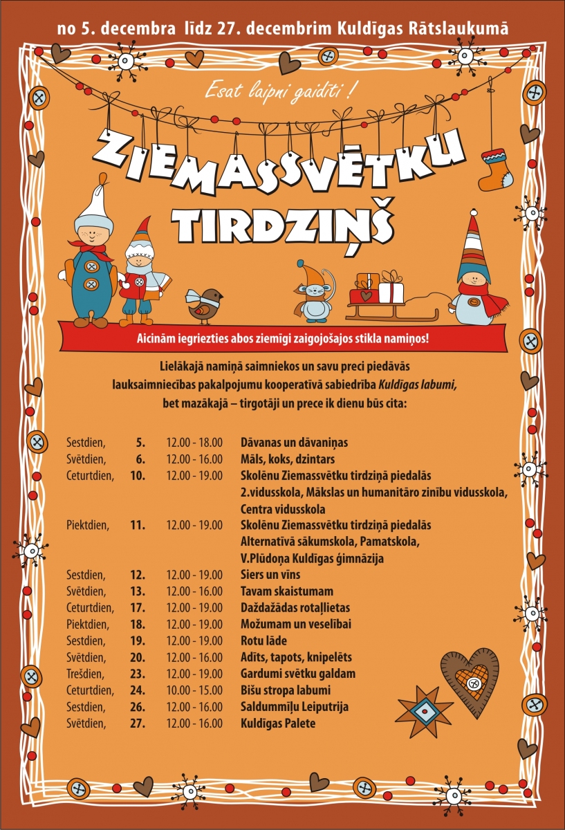 Rātslaukuma Rūķu ciems ar jautrajiem un izdomas bagātajiem rūķiem un Kuldīgas Ziemassvētku tirdziņš ik nedēļu no ceturtdienas līdz svētdienai darbosies līdz pat 27. decembra pēcpusdienai. Ņemiet vērā, ka šogad tirdziņa piedāvājums stikla mājiņās būs ļoti daudzveidīgs un mainīgs – dāvanas un citas labas lietas varēsiet iegādāties īpašās sveču, skaistuma, rokdarbu, saldumu, siera, vīna un citās tematiskajās dienās.