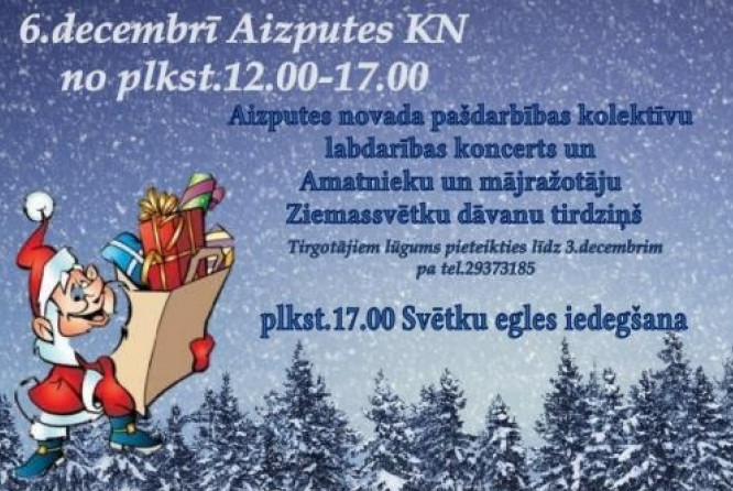 Svētdien, 6. decembrī, no pulksten 12 līdz 17 Aizputes kultūras namā notiks Aizputes novada pašdarbības kolektīvu labdarības koncerts un amatnieku un mājražotāju Ziemassvētku dāvanu tirdziņš.