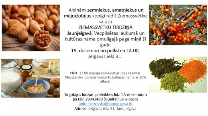 Aicinām zemniekus, amatniekus un mājražotājus kopīgi radīt Ziemassvētku sajūtu Ziemassvētku tirdziņā Jaunjelgavā, Vecpilsētas laukumā un kultūras nama omulīgajā pagalmiņā šī gada 19. decembrī no plkst. 14:00, Jelgavas ielā 31.