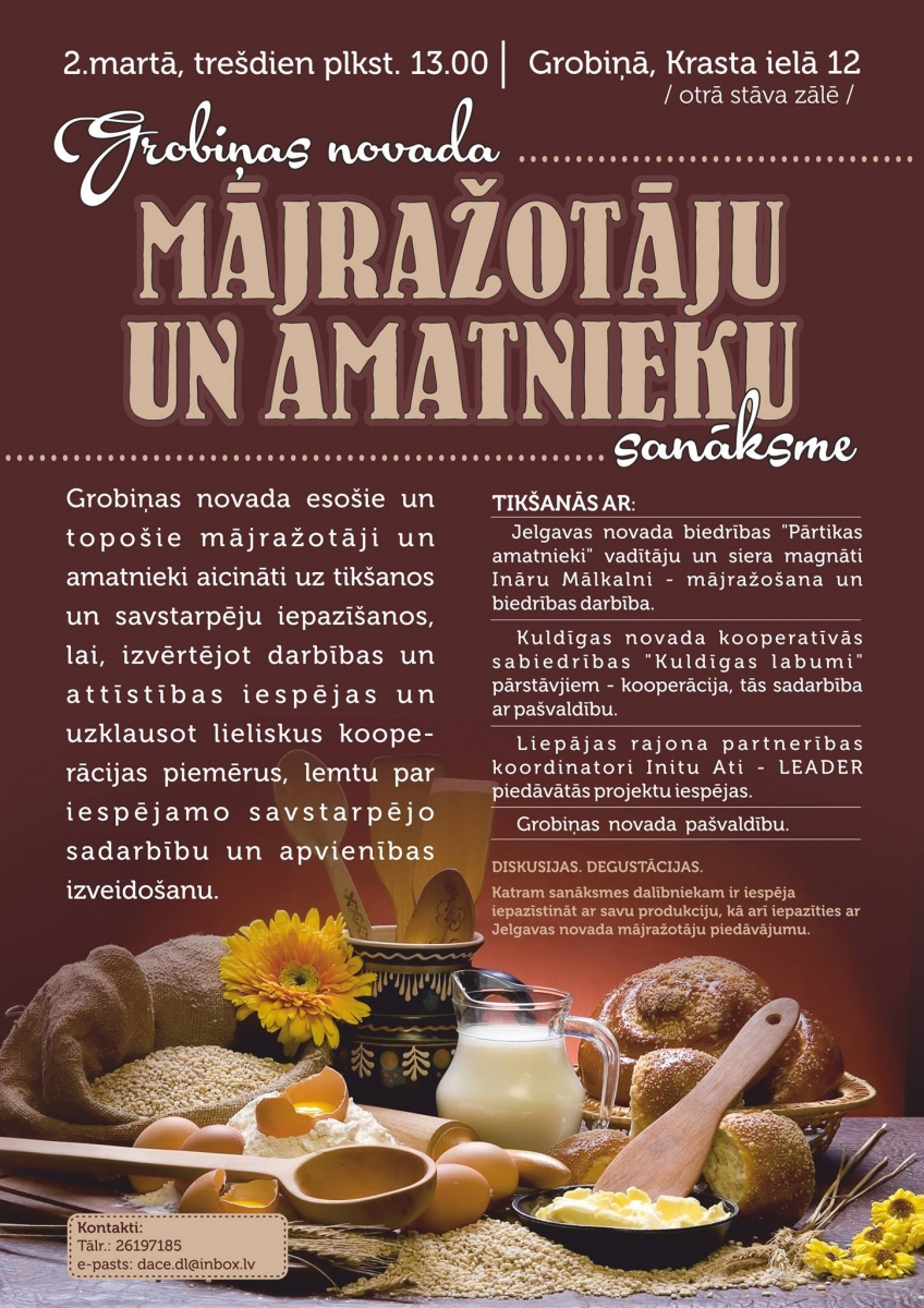 Grobiņas novada mājražotāji, amatnieki, mazie uzņēmumi, individuālie ražotāji, zemnieku un piemājas saimniecības, kas vēlas uzsākt mājražošanu vai nodarbojas ar amatniecību tiek aicināti uz tikšanos. Iepazīsim viens otru, iepazīsimies ar citu Latvijas novadu mājražotājiem un viņu darbību, uzzināsim par finansiāla atbalsta iespējām tuvākajā nākotnē.