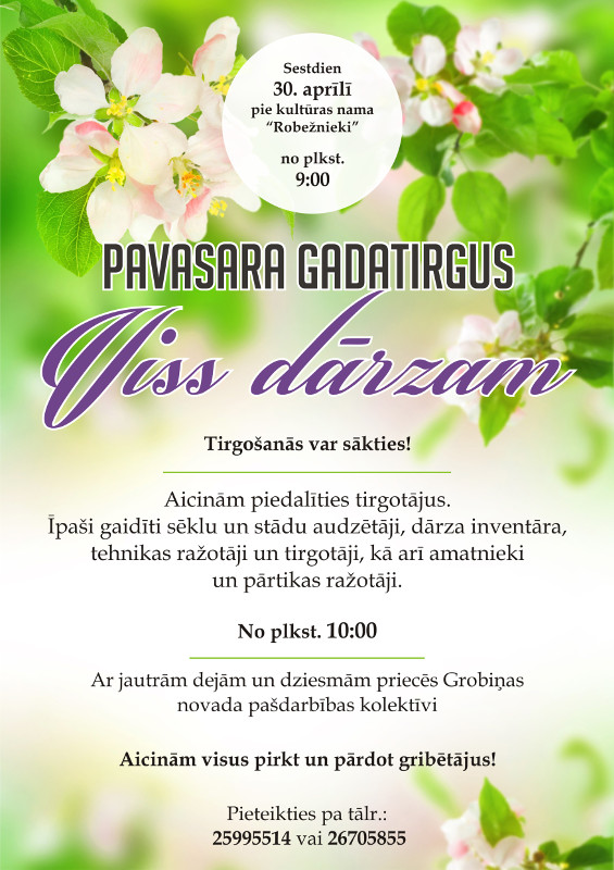 Sestdien, 30. aprīlī pie Grobiņas kultūras nama "Robežnieki" visi aicināti uz pavasara gadatirgu "VISS DĀRZAM".