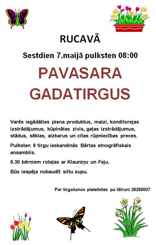 Rucavā, sestdien 7.maijā plkst. 08:00 PAVASARA GADATIRGUS.