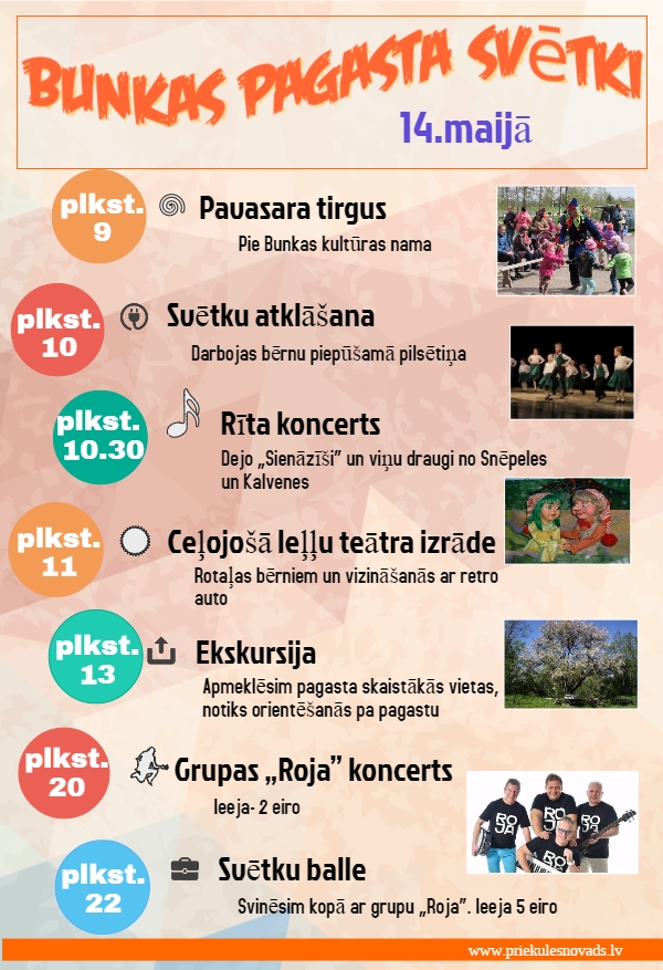 Sestdien, 2016. gada 14.maijā no pulksten 9 pie Bunkas kultūras nama notiks pagasta svētki un pavasara tirgus.