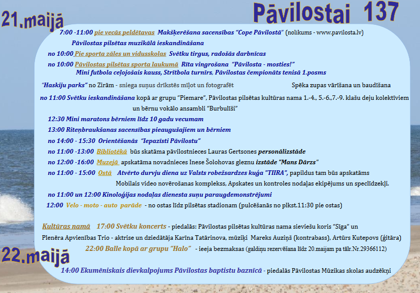 21. maijā no pulksten 7 visas dienas garumā notiks Pāvilostas pilsētas svētki "Pāvilostai 137" ar makšķerēšanas sacensībām, svētku tirgu un radošām darbnīcām, rīta vingrošanu un sportiskām aktivitātēm, suņu paraugdemonstrējumiem, mūziku, balli un daudzām citām interesantām aktivitātēm.