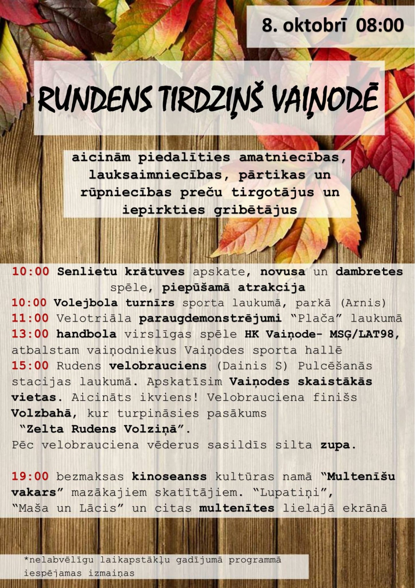 Šo sestdien, 8. oktobrī Vaiņodes novads dome, sadarbībā ar Biedrība "Volzbahs", ielūdz ikvienu interesentu uz rudens tēmai veltītiem pasākumiem Vaiņodē. Dienas iesākumā, Vaiņodes centrā notiks “Rudens tirdziņš”, kura laikā būs iespējams apskatīt senlietu krātuvi, izmēģināt savu meistarību novusa un dambretes spēlēs, vērot volejbola turnīru, kā arī baudīt velotriāla paraugdemonstrējumus.