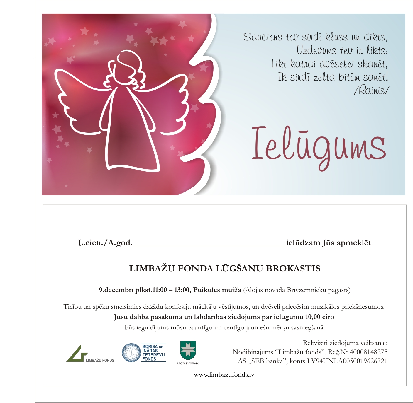 No sirds būsim pateicīgi par ikviena interesenta dalību pasākumā, kas būs kā apliecinājums Limbažu fonda darbības nepieciešamībai.