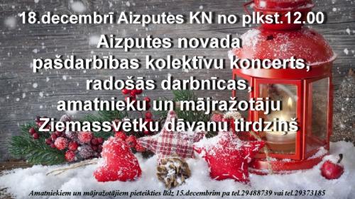 Aizputes novada pašdarbības kolektīvu koncerts, radošās darbnīcas, amatnieku un mājražotāju Ziemassvētku dāvanu tirdziņš.