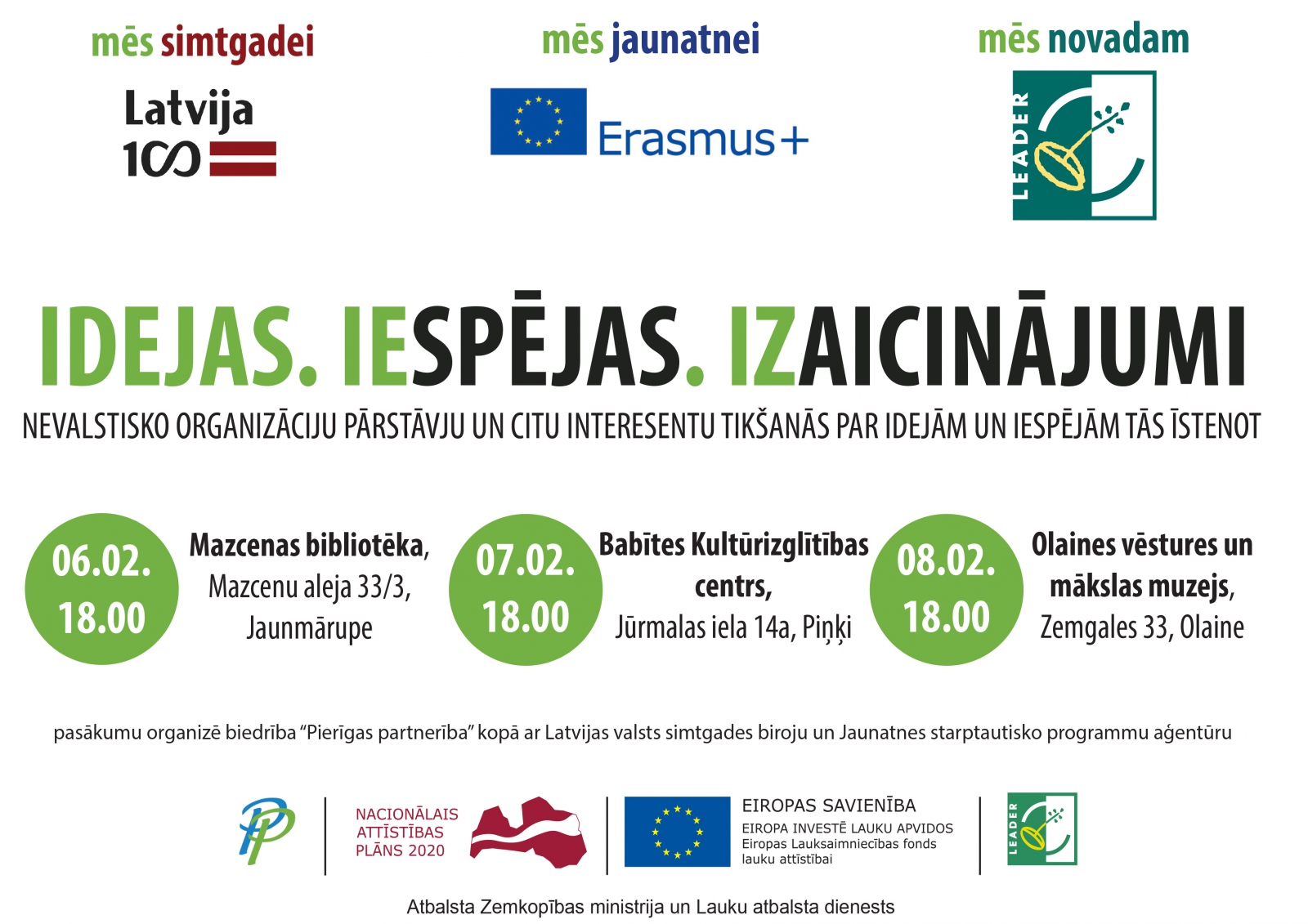 Biedrība „Pierīgas partnerība” kopā ar Latvijas valsts simtgades biroju un Jaunatnes starptautisko programmu aģentūru piedāvā vietējiem iedzīvotājiem – nevalstisko organizāciju pārstāvjiem un citiem interesentiem – no Mārupes, Olaines un Babītes novadiem tikšanos, kurā būs iespēja ģenerēt idejas Latvijas simtgadei, uzzināt par jau esošajām iniciatīvām un iespējām, uzzināt par Erasmus+ programmas iespējām neformālajā izglītībā un darbā ar jaunatni, kā arī iepazīties ar sabiedrības virzītas vietējās attīstības stratēģiju un atbalsta iespējām savu ideju īstenošanai.