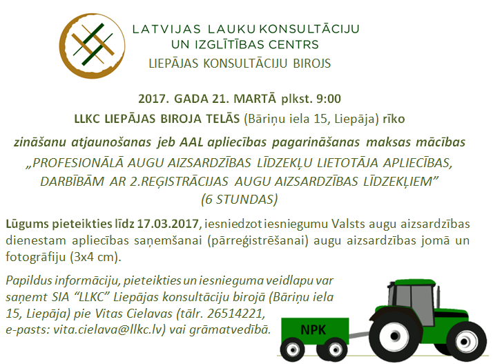 SIA “Latvijas Lauku konsultāciju un izglītības centrs” (LLKC) Liepājas konsultāciju birojs piedāvā zināšanu atjaunošanas jeb augu aizsardzības līdzekļu (AAL) lietotāju apliecības pagarināšanas maksas mācības - „Profesionālā augu aizsardzības līdzekļu lietotāja apliecības, darbībām ar 2.reģistrācijas augu aizsardzības līdzekļiem” (6 stundas).