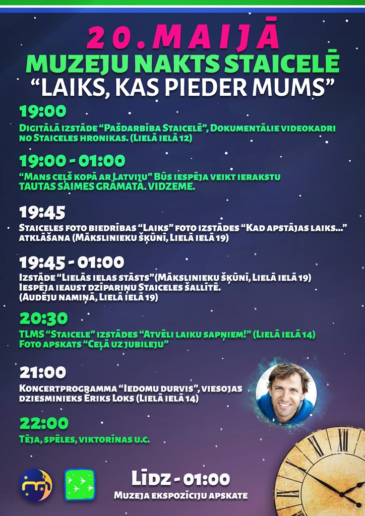 19:45 Staiceles foto biedrības "Laiks" izstādes "Kad apstājas laiks" atklāšana ( Mākslinieku šķūnī, Lielā ielā 19)