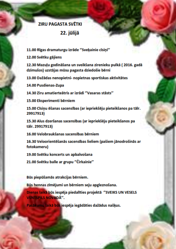 Ziru pagasts savos svētkos priecēs apmeklētājus ar divām teātra izrādēm, svētku balli un alus ātrdzeršanas sacensībām. Visi laipni gaidīti!