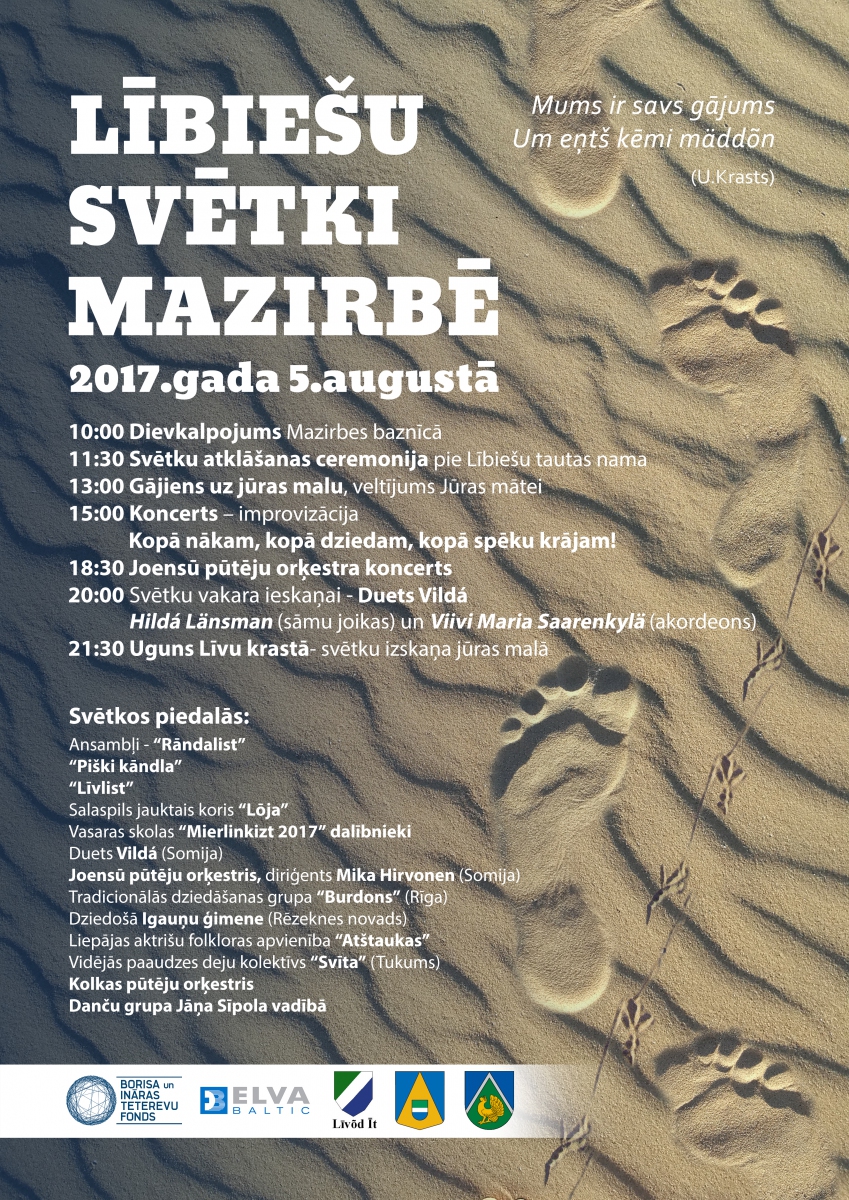Datums: 5. Augusts, 2017Nozare: Lauku telpaLībiešu svētki notiks Mazirbē, 2017.gada 5.augustā. Kontaktinformācija: Līvu (lībiešu) savienība, Ieva Ernštreite, t.29110828Reģions filtram: Ventspils novads
