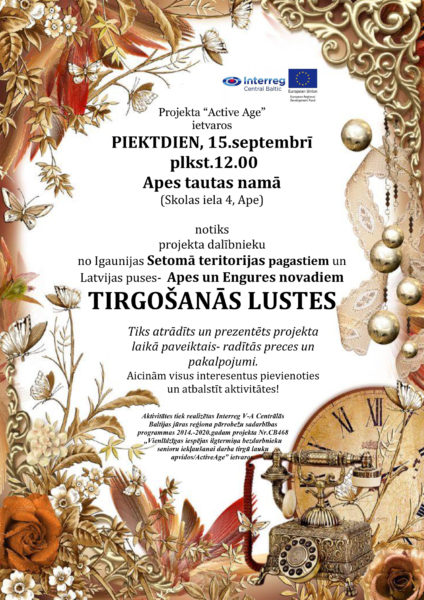 Projekta “Active Age” ietvaros 15.septembī plkst.12.00 Apes tautas namā (Skolas iela 4, Ape) notiks projekta dalībnieku no Igaunijas Setomā teritorijas pagastiem un Latvijas puses- Apes un Engures novadiem tirgošanās lustes. Tiks atrādīts un prezentēts projekta laikā paveiktais- radītās preces un pakalpojumi. Aicinām visus interesentus pievienoties un atbalstīt aktivitātes!