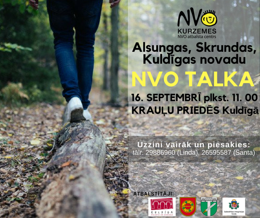 Biedrību pārstāvji un aktīvie iedzīvotāji aicinātas pieteikties talkai līdz 12.septembrim elektroniski http://ej.uz/NVOtalka vai pie talkas koordinatorēm: Linda (tālr. 29886960) un Santa (tālr. 26595587).