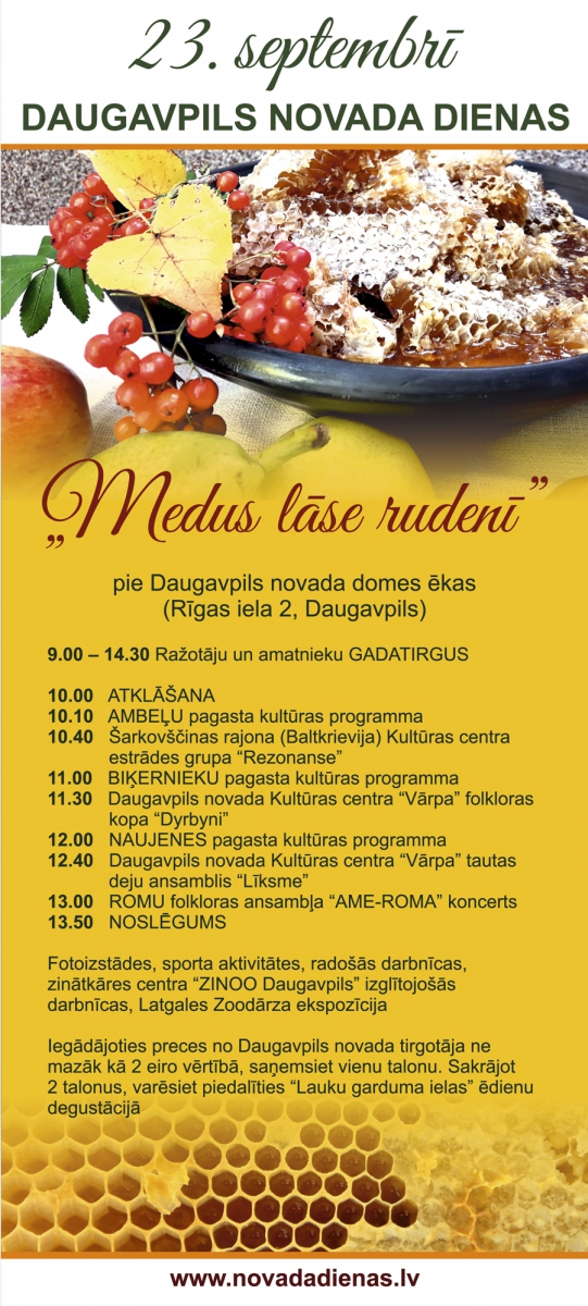 Daugavpils novada dienas jau tradicionāli tiek rīkotas septembrī, ar mērķi sekmēt novada atpazīstamību, sniegt lielisku iespēju Daugavpils un Latgales iedzīvotājiem iepazīt lauku ražotāju un tautas mantojuma produktu vērtības, kulināro mantojumu, tūrisma iespējas, bagātās tradīcijas un godināt amata prasmju nesējus. Arī šogad 23. septembrī ar plašu kultūras programmu un citām aktivitātēm apmeklētājus aicinās Novada dienu gadatirgus, kas norisināsies no plkst. 09.00 līdz 14.30 Rīgas ielā 2, Daugavpilī.