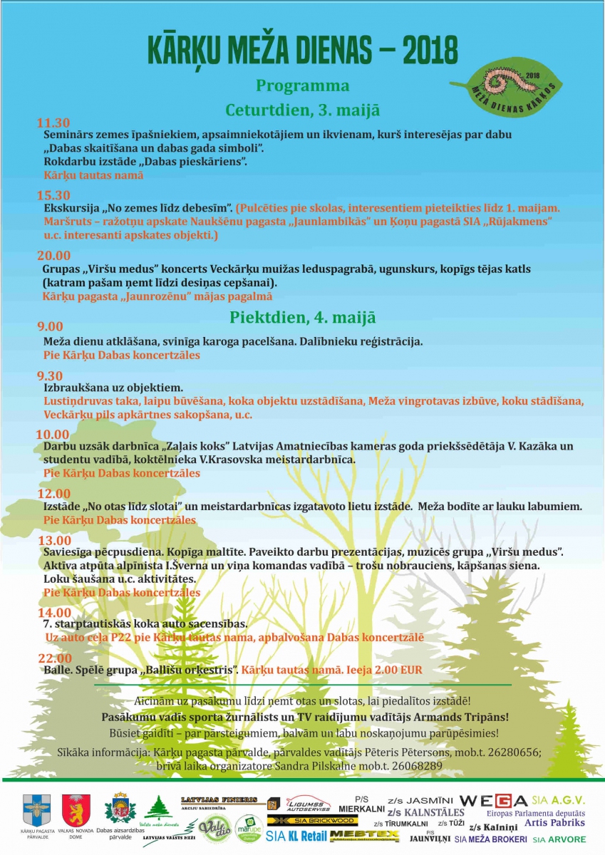 4. maijā Meža dienu atklāšana pulksten 9.00. Pēc tam dosimies uz vairāk nekā 10 darba objektiem. Darbi plānoti Lustiņdruvā, kur tiks izbūvētas jaunas laipas, Meža vingrotava, darbi noritēs arī pie Veckārķu pils, Ķires krastā, sakopsim Liģkroga dižliepas apkārtni, vāksim mežos atkritumus, kā arī darbs paredzēts vēl vairākos citos objektos. darbosies Zaļā koka darbnīca, amatnieksViļņa Krasovska meistardarbnīca, atvērta būs Rūķa Dabas bodīte. .......Pulksten 14.00 notiks 7. starptautiskās koka auto sacensības. Pasākumu vadīs TV sporta žurnālists Armands Tripāns. Labu omu uzturēs un vakarā tautas namā ballē spēlēs grupa “Ballīšu orķestris”.