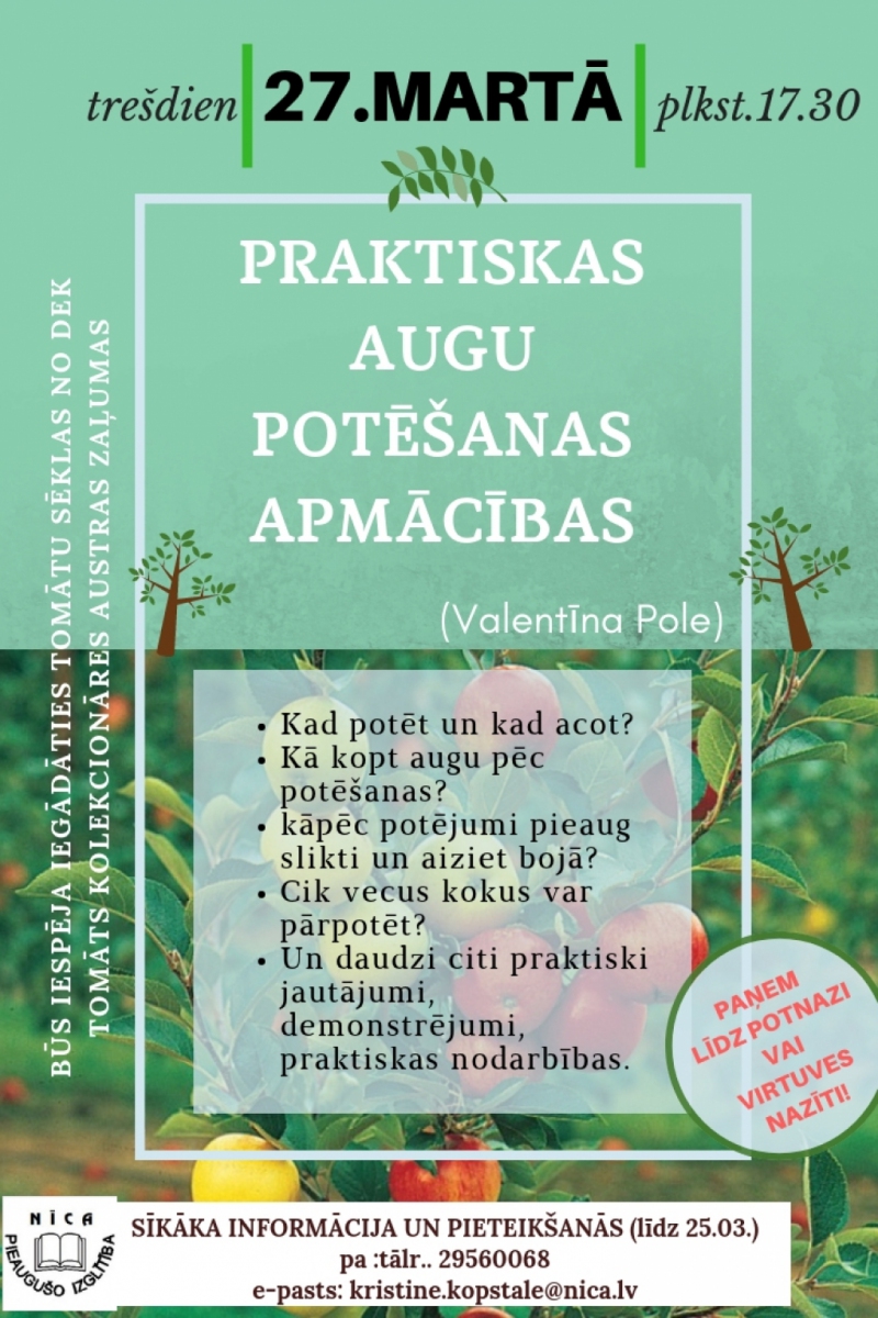 Trešdien, 2019. gada 27. martā plkst. 17.30 Nīcas pieaugušo izglītības centrā notiks augu potēšanas apmācības kopā ar Valentīnu Poli.