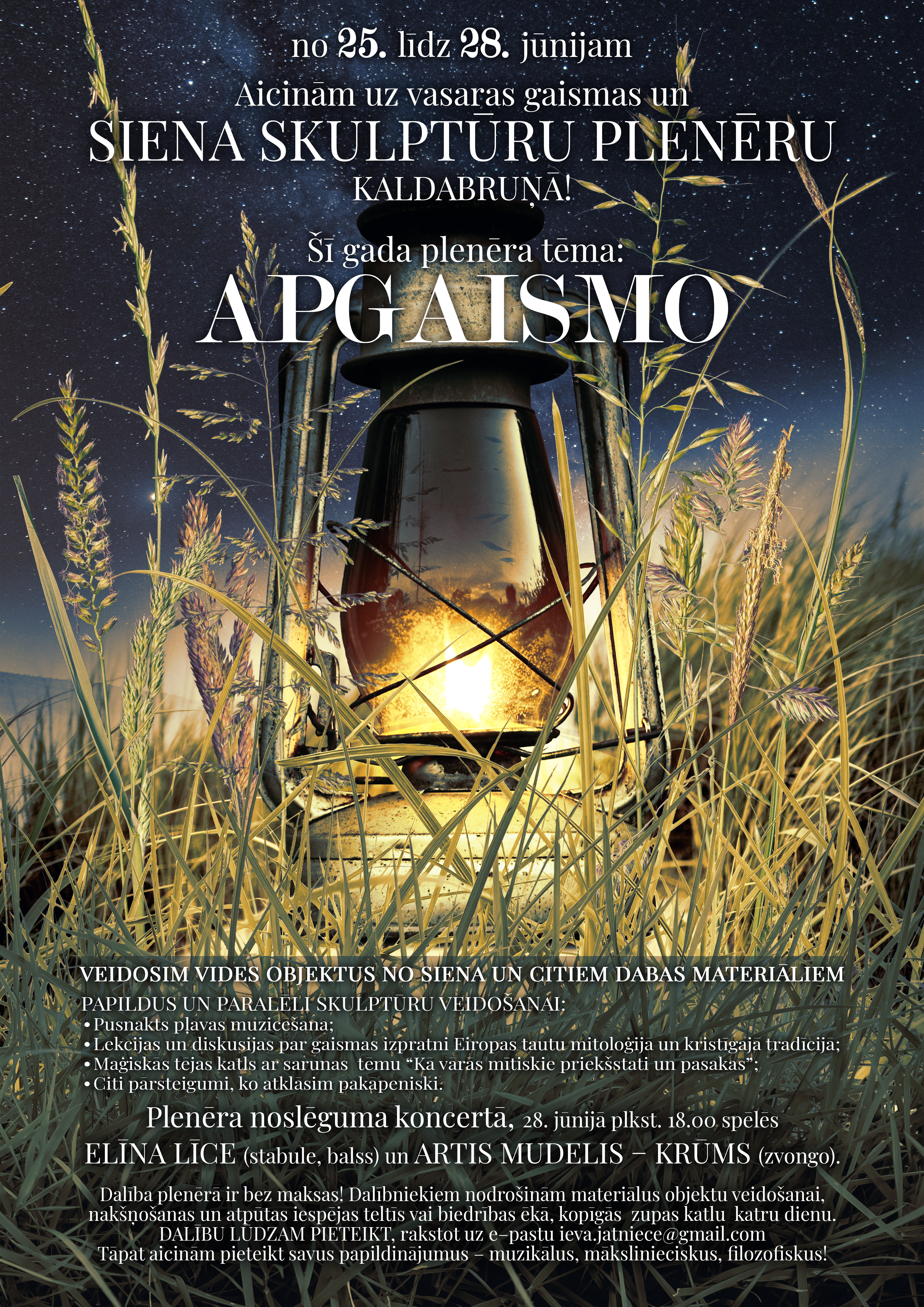 Biedrība “Ūdenszīmes” no 25.līdz 28. jūnijam aicina uz vasaras gaismas un siena skulptūru plenēru Kaldabruņā. Šī gada tēma ir „APGAISMO”. Veidosim vides objektus no siena un citiem dabas materiāliem. Papildus un paralēli skulptūru veidošanai : muzicēšana, lekcijas un diskusijas, citi pārsteigumi.