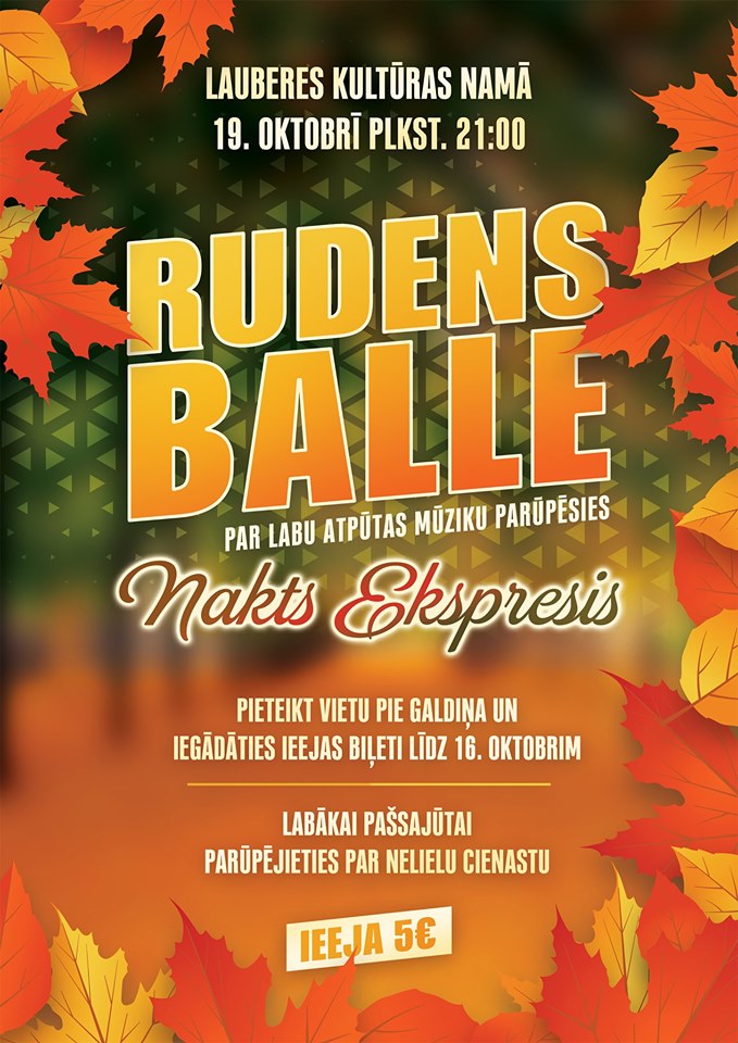 19.oktobrī plkst. 21.00 rudens balle Lauberes kultūras namā, muzicēs Nakts Ekspresis.