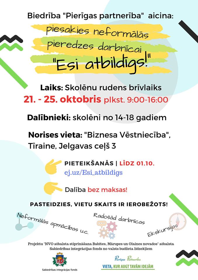 Skolēnu rudens brīvlaikā, no 21. līdz 25. oktobrim jebkuram 14-18 gadus vecam interesentam ir iespēja pieteikties dalībai ar neformālās pieredzes darbnīcai “Esi atbildīgs!”. Tajā notiks neformālās apmācības, radošās darbnīcas un ekskursijas, kas interesantā un saistošā veidā rosinās jauniešus kļūt atbildīgākiem. Darbnīcu cikls sadalīts piecos tematiskos blokos –sabiedrība, saskarsme, vide, sports, uzņēmējdarbība. Katrai dienai paredzēta atšķirīga programma, tiks nodrošinātas pusdienas un transports, lai nogādātu uz ekskursiju norises vietām.