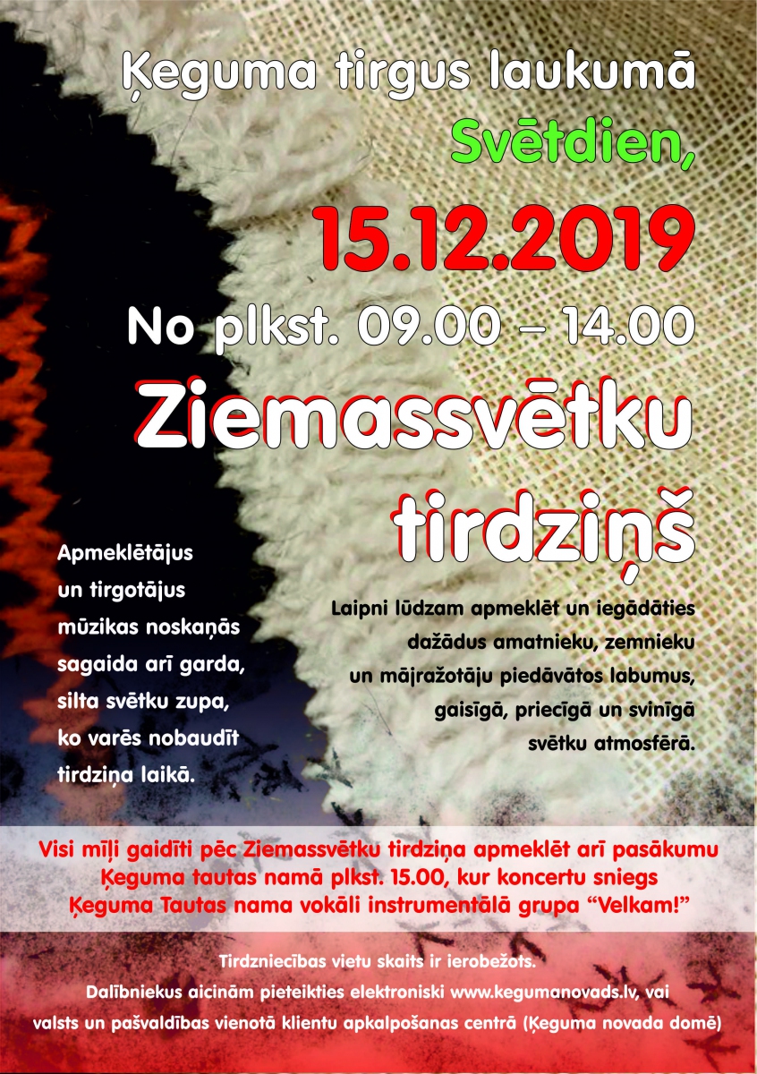 Visi mīļi gaidīti pēc Ziemassvētku tirdziņa apmeklēt arī pasākumu Ķeguma Tautas namā plkst.15.00, kur koncertu sniegs Ķeguma Tautas nama vokāli instrumentālā grupa “Velkam!”