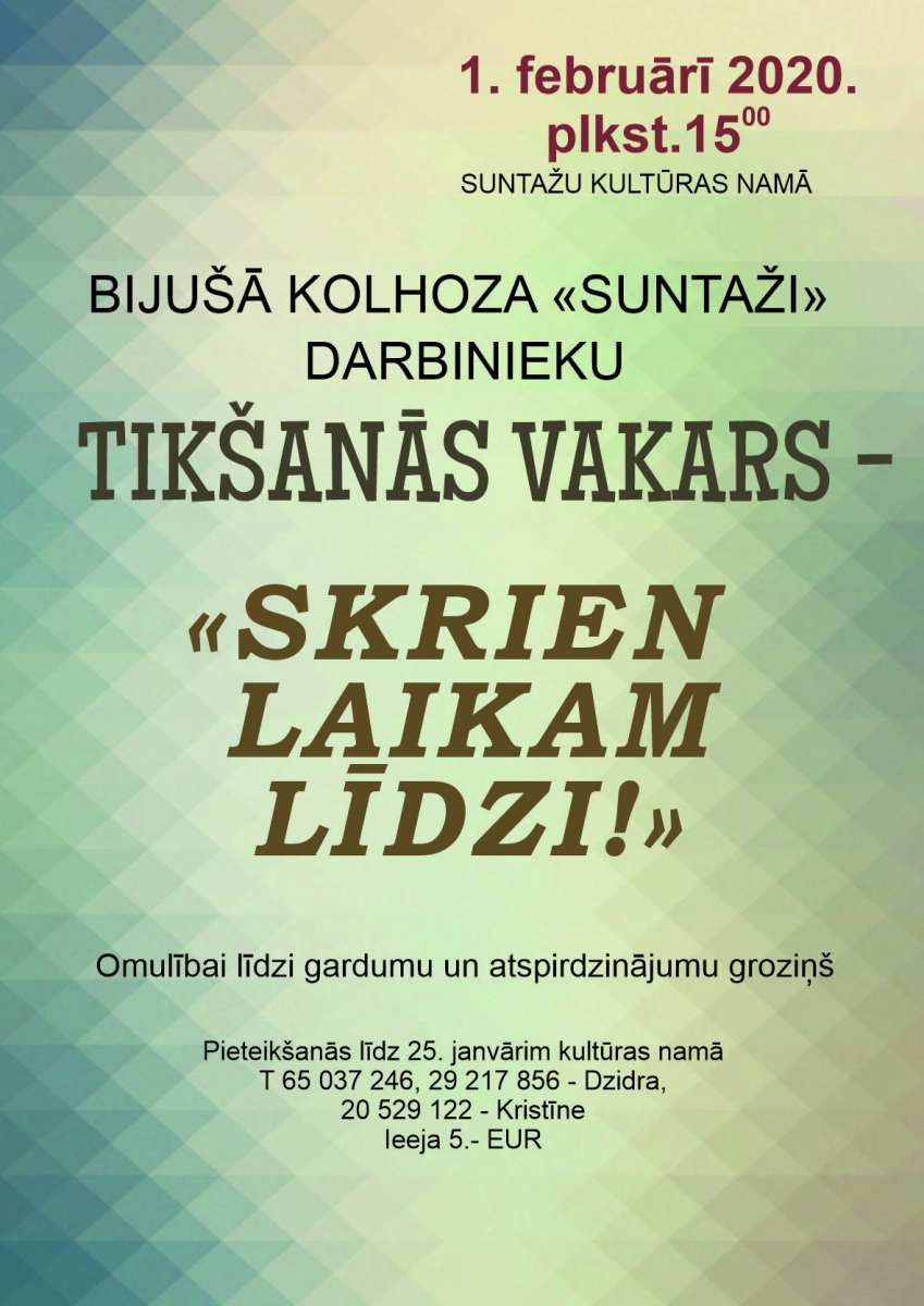 1. februārī plkst. 15.00 Suntažu Kultūras namā bijušā kolhoza "Suntaži" dalībnieku tikšanās vakars "Skrien laikam līdzi!". Pieteikšanās līdz 25. janvārim, tālr. 65037246, 29217856 (Dzidra); 20529122 (Kristīne).