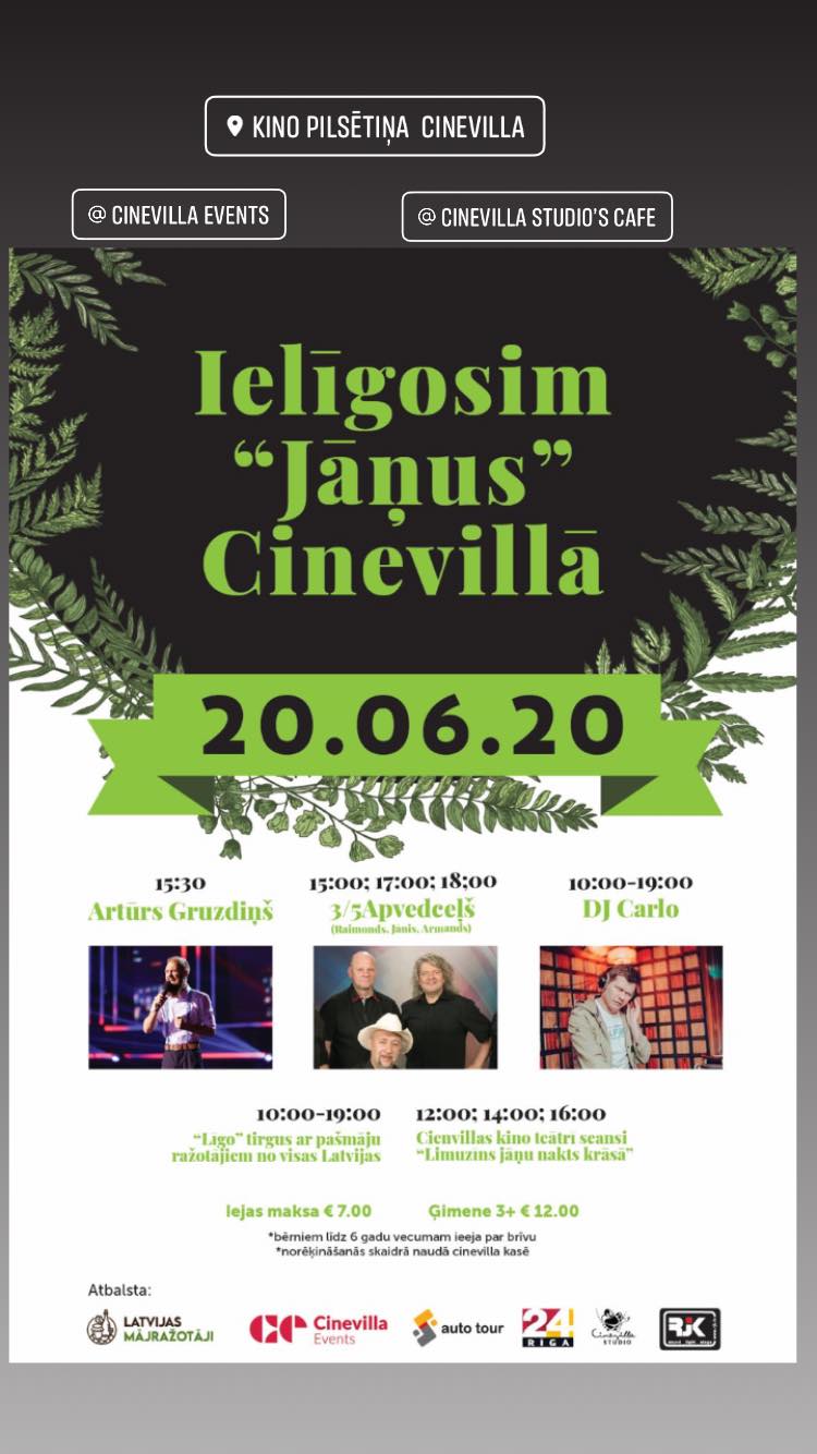 Dziesmas, rotaļas, dejas un lielākais mājražotāju tirdziņš ar pašmāju ražotājiem, kā arī pārsteigumi, konkursi visas dienas garumā! "Līgo" tirgus ar pašmāju ražotājiem no visas Latvijas. Visas dienas garumā apmeklētājus priecēs Dj Carlo. Pēcpusdienā pl. 15.30 uzstāsies Artūrs Gruzdiņš un grupa "3/5 Apvedceļš" pl.15.00, 17.00 un 18.00. Filmas "Limuzīns Jāņu nakts krāsā" skatīšanās Cinevillas kinoteātrī pl. 12.00, 14.00 un 16.00.