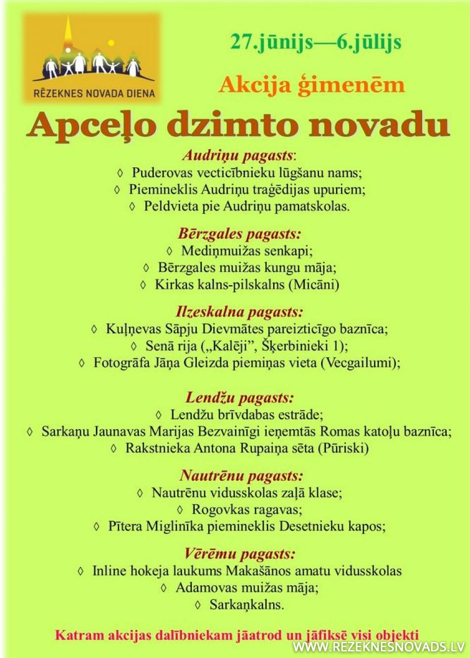 Tuvojoties novada svētkiem, Nautrēnu pagastu apvienība piedāvā apceļot dzimto novadu. Tāpēc no 27.jūnija līdz 6. jūlijam tiek rīkota akcija “Apceļo dzimto novadu”. Laikā, kad valsts un pasaule dzīvo ierobežojumu varā, piedāvājam savu dzimto pusi atklāt no jauna, apmeklējot dažādas interesantas vietas un objektus, izzinot to vēsturi un nozīmi.