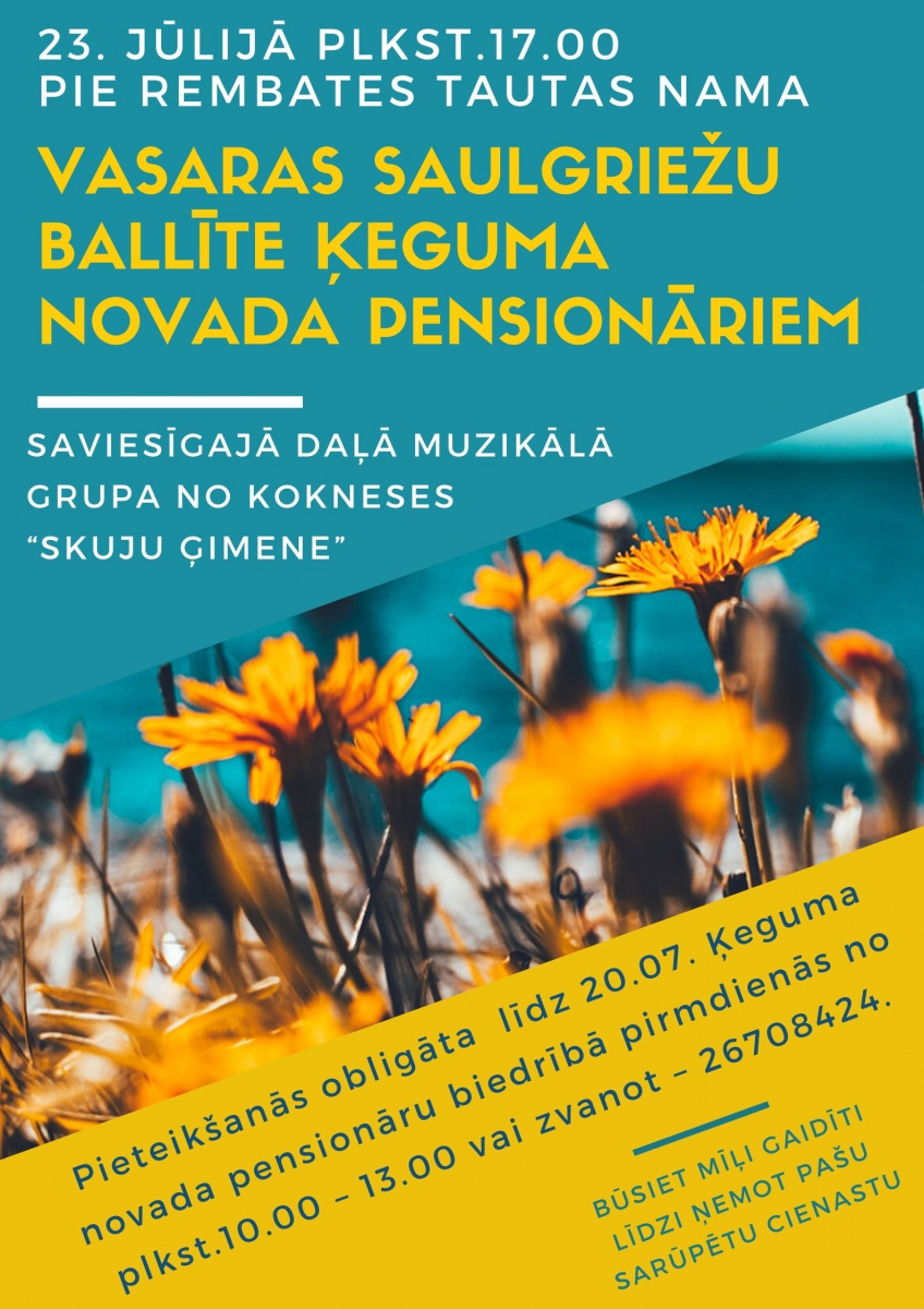 23. jūlijā plkst.17.00 pie Rembates Tautas nama Vasaras saulgriežu ballīte Ķeguma novada pensionāriem.