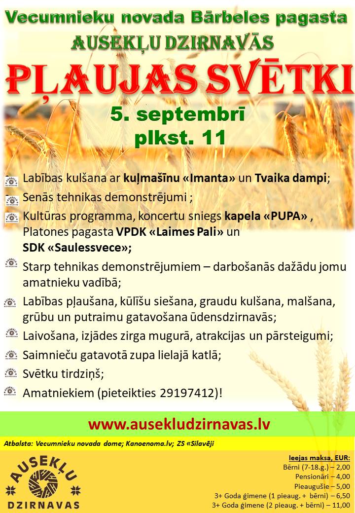 Vieni no gaidītākajiem svētkiem "Ausekļu dzirnavu" brīvdabas muzejā ir tradicionālie "Pļaujas svētki", kas norisināsies 2020. gada 5. septembrī no plkst. 11:00, ar Tvaika dampja svilpes skaņām ieskandinot nu jau divpadsmito pasākumu. Pavasarī apsētais demonstrējumu lauks gaida ražas novākšanu un senā muzeja tehnika - ražas pārstrādi. Darbus un senos arodus palīdzēs iepazīt amatnieki no tuvākiem un tālākiem Latvijas novadiem.