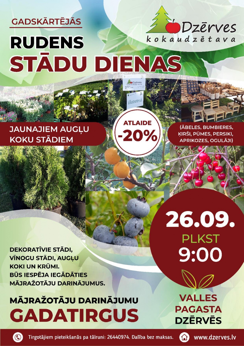 Būs iespējams iegādāties jaunos augļu koku stādus ar 20% atlaidi. Ābeles, bumbieres, ķirši, plūmes, persiki, aprikozes, ogulāji būs plašā izvēlē. Kā arī dekoratīvie stādi, augļu koki un krūmi.